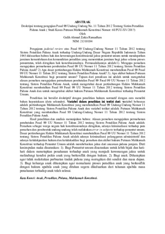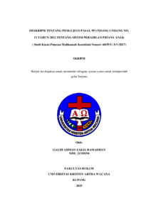 RAMADHAN, Galih Ahmad Zakia (2025) DESKRIPSI TENTANG PENGUJIAN PASAL 99 UNDANG UNDANG NO. 11 TAHUN 2012 TENTANG SISTIM PERADILAN PIDANA ANAK: (Studi Kasus Putusan Mahkamah Konstitusi Nomor: 68/PUU-XV/2017). Undergraduate thesis, Artha Wacana Christian University.