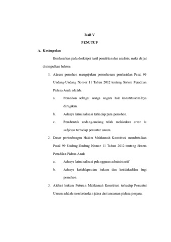 Pengajaun judicial review atas Pasal 99 Undang-Undang Nomor 11 Tahun 2012 tentang Sistem Peradilan Pidana Anak terhadap Undang-Undang Dasar Negara Republik Indonesia Tahun 1945 didasarkan bahwa hak dan kewenangan konstitusional jaksa penuntut umum untuk mendapatkan jaminan kemerdekaan dan kemandirian peradilan yang menentukan jaminan bagi jaksa selama proses penuntutan, telah dirugikan hak konstitusionalnya. Permasalahannya adalah:1). Mengapa pemohon mengajukan permohonan pembatalan Pasal 99 UU Nomor 11 Tahun 2012 tentang Sistem Peradilan Pidana Anak? 2) Apa dasar pertimbangan Hakim Mahkamah Konstitusi membatalkan Pasal 99 Pasal 99 UU Nomor 11 Tahun 2012 tentang Sistem Peradilan Pidana Anak? 3). Apa akibat hukum Putusan Mahkamah Konstitusi bagi penuntut umum? Tujuan dari penulisan ini adalah untuk mengetahui alasan pemohon mengajukan permohonan pembatalan Pasal 99 Pasal 99 UU Nomor 11 Tahun 2012 tentang Sistem Peradilan Pidana Anak, untuk mengetahui dasar pertimbangan Hakim Mahkamah Konstitusi membatalkan Pasal 99 Pasal 99 UU Nomor 11 Tahun 2012 tentang Sistem Peradilan Pidana Anak dan untuk mengetahui akibat hukum Putusan Mahkamah Konstitusi terhadap Penuntut Umum. Penelitian ini bersifat deskriptif dengan penelitian hukum normatif dengan cara meneliti bahan kepustakaan (data sekunder). Variabel dalam penelitian ini terdiri dari: variabel bebasnya adalah pertimbangan Mahkamah Konstitusi yang membatalkan Pasal 99 Undang-Undang Nomor 11 Tahun 2012 tentang Sistem Peradilan Pidana Anak dan variabel terikat adalah: Putusan Mahkamah Konstitusi yang membatalkan Pasal 99 Undang-Undang Nomor 11 Tahun 2012 tentang Sistem Peradilan Pidana Anak. Hasil penelitian dan analisis menunjukan bahwa: Alasan pemohon mengajukan permohonan pembatalan Pasal 99 UU Nomor 11 Tahun 2012 tentang Sistem Peradilan Pidana Anak adalah: Pemohon sebagai warga negara hak konstitusionalnya dirugikan, adanya kriminalisasi terhadap para pemohon dan pembentuk undang-undang telah melakukan error in subjecto terhadap penuntut umum. Dasar pertimbangan Hakim Mahkamah Konstitusi membatalkan Pasal 99 UU Nomor 11 Tahun 2012 tentang Sistem Peradilan Pidana Anak adalah adanya kriminalisasi pelanggaran administratif dan adanya ketidakpastian hukum dan ketidakadilan bagi pemohon dan akibat hukum Putusan Mahkamah Konstitusi terhadap Penuntut Umum adalah membebaskan jaksa dari ancaman pidana penjara. Dari kesimpulan maka disarankan: 1). Bagi Penuntut umum disarankan untuk lebih bijak dan hati-hati dalam menetapkan penahanan terhadap anak yang menjadi kewenangan jaksa untuk melindungi kondisi psikis anak yang berkonflik dengan hukum. 2). Bagi anak. Diharapkan agar tidak melakukan perbuatan tindak pidana yang merugikan diri sendiri dan masa depan. 3). Bagi keluarga anak diharapkan agar memahami proses peradilan anak yang berkonflik dengan hukum apabila anak yang ditahan segera dikeluarkan dari tahanan apabila masa penahanan terhadap anak telah selesai.