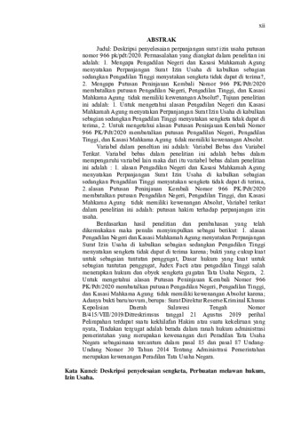 Permasalahan yang diangkat dalam penelitian ini adalah: 1. Mengapa Pengadilan Negeri danKasasi Mahkamah Agung menyatakan Perpanjangan Surat Izin Usaha di kabulkan sebagian sedangkan Pengadilan Tinggi menyatakan sengketa tidak dapat di terima?, 2. Mengapa Putusan Peninjauan KembaliNomor 966 PK/Pdt/2020 membatalkan putusan Pengadilan Negeri, Pengadilan Tinggi, dan Kasasi Mahkama Agung tidak memiliki kewenangan Absolut?, Tujuanpenelitianini adalah: 1. Untuk mengetahui alasan Pengadilan Negeri danKasasi Mahkamah Agung menyatakan Perpanjangan Surat Izin Usaha di kabulkan sebagian sedangkan Pengadilan Tinggi menyatakan sengketa tidak dapat di terima,2. Untuk mengetahui alasan Putusan Peninjauan KembaliNomor 966 PK/Pdt/2020 membatalkan putusan Pengadilan Negeri, Pengadilan Tinggi, danKasasi Mahkama Agung tidak memiliki kewenangan Absolut. Variabel dalam peneltian ini adalah: Variabel Bebas dan Variabel Terikat. Variabel bebas dalam penelitian ini adalah bebas dalam mempengaruhi variabel lain maka dari itu variabel bebas dalam penelitian ini adalah: 1. alasan Pengadilan Negeri danKasasi Mahkamah Agung menyatakan Perpanjangan Surat Izin Usaha di kabulkan sebagian sedangkan Pengadilan Tinggi menyatakan sengketa tidak dapat di terima,2. alasan Putusan Peninjauan KembaliNomor 966 PK/Pdt/2020 membatalkan putusan Pengadilan Negeri, Pengadilan Tinggi, danKasasi Mahkama Agung tidak memiliki kewenangan Absolut, Variabel terikat dalam penelitian ini adalah:putusan hakim terhadap perpanjangan izin usaha. Berdasarkan hasil penelitian danpembahasan yang telah dikemukakan maka penulis menyimpulkan sebagai berikut: 1. alasan Pengadilan Negeri danKasasi Mahkamah Agung menyatakan Perpanjangan Surat Izin Usaha di kabulkan sebagian sedangkan Pengadilan Tinggi menyatakan sengketa tidak dapat di terimakarena; bukti yang cukup kuat untuk sebagaian tuntutan penggugat, Dasar hukum yang kuat untuk sebagian tuntutan penggugat, Judex Facti atau pengadilan Tinggi salah menerapkan hukum dan obyek sengketa gugatan Tata Usaha Negara, 2. Untuk mengetahui alasan Putusan Peninjauan Kembali Nomor 966 PK/Pdt/2020 membatalkan putusan Pengadilan Negeri, Pengadilan Tinggi, dan Kasasi Mahkama Agung tidak memiliki kewenangan Absolut karena; Adanya bukti baru/novum, berupa: Surat Direktur Reserse Kriminal Khusus Kepolisian Daerah Sulawesi Tengah Nomor B/415/VIII/2019 /Ditreskrimsus tanggal 21 Agustus 2019 perihal Pelimpahan terdapat suatu kekhilafan Hakim atau suatu kekeliruan yang nyata, Tindakan tergugat adalah berada dalam ranah hukum administrasi pemerintahan yang merupakan kewenangan dari Peradilan Tata Usaha Negara sebagaimana tercantum dalam pasal 85 danpasal 87 Undang-Undang Nomor 30 Tahun 2014 Tentang Administrasi Pemerintahan merupakan kewenangan Peradilan Tata Usaha Negara.