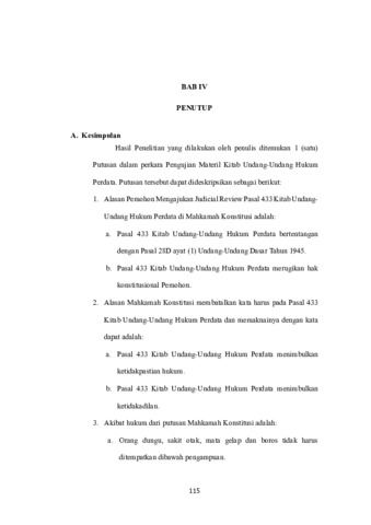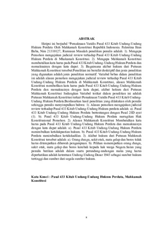 Rumusan Masalah penelitian penulis adalah: 1). Mengapa Pemohon mengajukan judicial review terhadap Pasal 433 Kitab Undang-Undang Hukum Perdata di Mhakamah Konstitusi. 2). Mengapa Mahkamah Konstitusi membatalkan kata harus pada Pasal 433 Kitab Undang-Undang Hukum Perdata dan memaknainya dengan kata dapat. 3). Bagaimana akibat hokum dari Putusan Mahkamah Konstitusi tersebut. Penelitian ini bersifat deskriptif dan jenis penelitian yang digunakan adalah jenis penelitian normatif. Variabel bebas dalam penelitian ini adalah alasan pemohon mengajukan judicial review terhadap Pasal 433 Kitab Undang-Undang Hukum Perdata di Mahkamah Konstitusi, alas an Mahkamah Konstitusi membatalkan kata harus pada Pasal 433 Kitab Undang-Undang Hukum Perdata dan memaknainya dengan kata dapat, akibat hokum dari Putusan Mahkamah Konstitusi Sedangkan Variabel terikat dalam penelitian ini adalah Putusan Mahkamah Konstitusi terkait Pemaknaan Yuridis Pasal 433 Kitab Undang-Undang Hukum Perdata. Berdasarkan hasil penelitian yang dilakukan oleh penulis sehingga penulis menyimpulkan bahwa: 1). Alasan pemohon mengajukan judicial review terhadap Pasal 433 Kitab Undang-Undang Hukum perdata adalah: a). Pasal 433 Kitab Undang-Undang Hukum Perdata bertentangan dengan Pasal 28D ayat (1). b). Pasal 433 Kitab Undang-Undang Hukum Perdata merugikan Hak Konstitusional Pemohon. 2). Alasan Mahkamah Konstitusi Membatalkan kata harus pada Pasal 433 Kitab Undang-Undang Hukum Perdata dan memaknainya dengan kata dapatadalah: a). Pasal 433 Kitab Undang-Undang Hukum Perdata menimbulkan ketidakpastian hukum. b). Pasal 433 Kitab Undang-Undang Hukum Perdata menimbulkan ketidakadilan. 3). Akibat hokum dari Putusan Mahkmah Konstitusi tersebut adalah: a). Orang dungu, sakit otak, matagelap dan boros tidak harus ditempatkan dibawah pengampuan. b). Pilihan menempatkan orang dungu, sakit otak, matagelap dan boros kembali kepada hak warga Negara. Saran yang penulis berikan adalah dalam suatu perundang-undangan maka yang harus diperhatikan adalah ketentuan Undang-Undang Dasar 1945 sebagai sumber hokum tertinggi dan sumber dari segala sumber hukum.