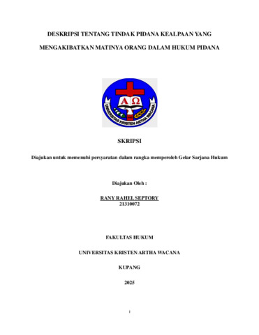 SEPTORY, Rany Rahel (2025) DESKRIPSI TENTANG TINDAK PIDANA KEALPAAN YANG MENGAKIBATKAN MATINYA ORANG DALAM HUKUM PIDANA. Undergraduate thesis, Artha Wacana Christian University.