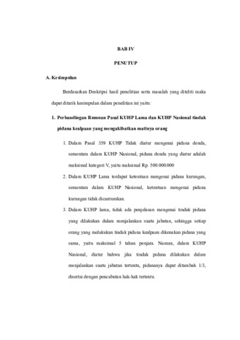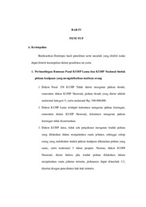 Rumusan masalah dalam penelitian ini adalah: 1. Bagaimana perbandingan pengaturan tindak pidana kealpaan yang mengakibatkan matinya orang dalam KUHP dan KUHP Nasional? 2. Bagaimana bentuk perbuatan yang dapat dikategorikan sebagai kealpaan yang menyebabkan matinya orang? 3. Bagaimana akibat hukum terjadinya tindak pidana kealpaan yang mengakibatkan matinya orang? Tujuan penelitian dari penulisan ini adalah: 1. Untuk mengetahui perbandingan pengaturan tindak pidana kealpaan yang mengakibatkan matinya orang dalam KUHP dan KUHP Nasional 2. Untuk mengetahui bentuk perbuatan yang dapat dikategorikan sebagai kealpaan yang menyebabkan matinya orang 3. Untuk mengetahui akibat hukum terjadinya tindak pidana kealpaan yang mengakibatkan matinya orang. Penelitian ini bersifat deskriptif dan jenis penelitian ini adalah penelitian normatif. Variabel bebas dalam penelitian ini adalah Perbandingan pengaturan tindak pidana kealpaan yang mengakibatkan matinya orang dalam KUHP dan KUHP Nasional, bentuk perbuatan dan akibat hukum terjadinya tindak pidana kealpaan yang mengakibatkan matinya orang. Variabel terikat dalam penelitian ini adalah putusan hakim terhadap terdakwa dalam kasus tindak pidana kealpaan yang mengakibatkan matinya orang. Berdasarkan hasil penelitian dan pembahasan maka yang menjadi kesimpulan adalah perbandingan pengaturan tindak pidana kealpaan yang mengakibatkan matinya orang dalam KUHP dan KUHP Nasional adalah 1. Dalam Pasal 359 KUHP Tidak diatur mengenai pidana denda, sementara dalam KUHP Nasional, pidana denda yang diatur adalah maksimal kategori V, yaitu maksimal Rp. 500.000.000. 2. Dalam KUHP Lama terdapat ketentuan mengenai pidana kurungan, sementara dalam KUHP Nasional, ketentuan mengenai pidana kurungan tidak dicantumkan. 3. Dalam KUHP lama, tidak ada penjelasan mengenai tindak pidana yang dilakukan dalam menjalankan suatu jabatan, sehingga setiap orang yang melakukan tindak pidana kealpaan dikenakan pidana yang sama, yaitu maksimal 5 tahun penjara. Namun, dalam KUHP Nasional, diatur bahwa jika tindak pidana dilakukan dalam menjalankan suatu jabatan tertentu, pidananya dapat ditambah 1/3, disertai dengan pencabutan hak-hak tertentu. Bentuk perbuatan yang dapat dikategorikan sebagi kealpaan yang menyebabkan matinya orang 1). Terdakwa dalam keadaan mengantuk dan kurang berkonsentrasi 2). Terdakwa tidak memasang kembali tanda peringatan yang jelas disekitar kebun yang dikelilingi kawat beraliran listrik 3). Terdakwa tidak Memeriksa kondisi sekitar lokasi terlebih dahulu 4). Terdakwa menembak kearah objek tanpa memastikan terlebih dahulu objek yang akan ditembak 5). Terdakwa tidak memeriksa keamanan senjata api. Akibat hukum terjadinya tindak pidana kealpaan yang mengakibatkan matinya orang 1). Terdakwa ditahan penjara 2). Terdakwa dipidana penjara 3). Terdakwa membayar biaya perkara 4). Barang bukti dimusnahkan, dikembalikan kepada terdakwa dan dikembalikan kepada keluarga korban. Saran : 1). Bagi pemerintah perlu melakukan edukasi kepada masyarakat mengenai kewajiban dan tanggungjawab hukum mereka, baik dalam kehidupan sehari-hari maupun dalam pekerjaan yang berisiko tinggi. Hal ini penting agar setiap individu dapat lebih berhati-hati dalam mengambil keputusan yang berpotensi membahayakan orang lain. 2). Bagi pelaku tindak pidana kealpaan adalah pelaku harus berkomitmen untuk tidak mengulangi perbuatan yang sama. Ini biasa dilakukan dengan, meningkatkan kesadaran diri, kewaspadaan serta mematuhi peraturan.