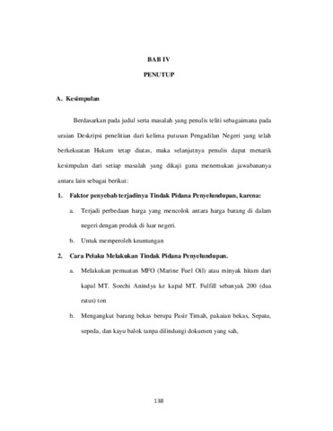 Rumusan masalah penelitian penulis adalah: 1.) Faktor-faktor apa yang menyebabkan terjadinya tindak pidana Penyelundupan ? 2.) Bagaimana cara pelaku melakukan tindak pidana penyelundupan ? 3.) Bagaimana akibat hukum dari tindak pidana penyelendupan terhadap pelaku dan barang bukti? Tujuan yang ingin penulis kaji adalah: 1.) Untuk megetahui faktor penyebab terjadinya Tindak Pidana Penyelundupan. 2.) Untuk mengetahui cara pelaku melakukan tindak pidana penyelundupan. 3.) Untuk mengethui akibat hukum tindak pidana penyelundupan terhadap terdakwa dan barang bukti Jenis Metode Penelitian yang penulis gunakan adalah: Jenis Penelitian Normatif dan Sifat Penelitian adalah bersifat deskriptif yakni penulis akan memaparkan secara lengkap, rinci, jelas dan sistematis hasil dalam bentuk karya ilmiah. Tentang faktor penyebab terjadinya Tindak Pidana Penyelundupan, cara pelaku melakukan tindak pidana penyelundupan Serta akibat hukum tindak pidana penyelundupan terhadap terdakwa dan barang bukti. Bahan hukum yang digunakan adalah bahan hukum primer yang terdiri dari putusan hakim serta peraturan perundang-undangan, traktat, kaidah dasar atau norma serta peraturan dasar. Berdasarkan Hasil Penelitian yang penulis teliti maka yang menjadi kesimpulan sesuai masalah yang penulis kaji yaitu: 1.) Faktor penyebab terjadinya Tindak Pidana Penyelundupan. a.) Karena terjadi perbedaan harga yang mencolok antara harga barang di dalam negeri dengan produk di luar negeri. b.) Untuk memperoleh keuntungan. 2.) Bentuk Tindak Pidana Penyelundupan; a.) Melakukan pemuatan MFO (Marine Fuel Oil) atau minyak hitam dari kapal MT. SOECHI ANINDYA ke kapal MT. FULFILL sebanyak 200 (dua ratus) ton, b.) Mengangkut barang bekas berupa Pasir Timah, pakaian bekas, Sepatu, sepeda, dan kayu balok tanpa dilindungi dokumen yang sah. 3.) Akibat hukum Tindak Pidana Penyelundupan terhadap Terdakwa dan negara. a.) Terdakwa ditahan dan dijatuhi hukuman pidana penjara, b) Terdakwa dijatuhi pidana denda, c) Terdakwa dibebani untuk membayar biaya perkara, serta terhadap Barang Bukti; a) Dirampas untuk Negara, b) Dikembalikan kepada pemiliknya, c) Dirampas untuk dimusnahkan.
