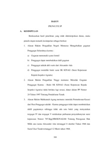 Permasalahan yang diangkat dalam penelitian ini adalah: Mengapa Hakim Pengadilan Negeri Memutus Mengabulkan Gugatan Penggugat Seluruhnya? dan Mengapa Hakim Pengadilan Tinggi dan Mahkamah Agung Memutus Menolak Gugatan Penggugat? Tujuan penelitian adalah Untuk mengetahui Alasan Apa Hakim Pengadilan Negeri Memutus Mengabulkan Gugatan Penggugat Seluruhnya Dan Untuk mengetahui Alasan Hakim Pengadilan Tinggi dan Mahkamah Agung Memutus Menolak Gugatan Penggugat Seluruhnya. Penelitian ini bersifat deskriptif dan menggunakan Jenis penelitian normatif. Penelitian ini menggunakan dua variabel, yaitu : Variabel Terikat dan Variabel Bebas. Variabel Terikat dalam penelitian ini adalah Putusan Pengadilan dalam penyelesaian sengketa Hak Atas tanah. Sedangkan Variabel Bebas dalam penelitian ini adalah Mengapa Hakim Pengadilan Negeri Memutus Mengabulkan Gugatan Penggugat Seluruhnya? Dan Mengapa Hakim pada Pengadilan Tinggi dan Mahkamah Agung Memutus Menolak Gugatan Pengggugat serta Alasan Hakim pada Pengadilan Negeri mengabulkan gugatan penggugat seluruhnya dan alasan Hakim pengadilan tinggi dan Mahkamah Agung menolak gugatan pengggugat seluruhnya. Berdasarkan hasil penelitian yang penulis lakukan maka Alasan Hakim Pengadilan Negeri Memutus Mengabulkan gugatan Penggugat Seluruhnya karena: Gugatan memenuhi syarat formil yaitu penggugat merupakan ahli waris yang sah, penggugat memiliki bukti surat SK KINAG, surat pemeriksaan tanh dan surat ukur tanah. Penggugat dapat membuktikan dalil gugatan, Penggugat adalah ahli waris dari Alexander Adu, Penggugat memiliki bukti surat SK KINAG (Surat Keputusan Kepala Inspeksi Agraria) dan Alasan Hakim Pengadilan Tinggi memutus Menolak Gugatan Penggugat Karena Bukti SK KINAG (Surat Keputusan Kepala Inspeksi Agraria) tidak berlaku lagi sesuai, diatur dalam PP Nomor 24 Tahun 1997 Tentang Pendaftaran Tanah. Serta Alasan Hakim Mahkamah Agung memutus menolak Permohonan Kasasi dari Para Penggugat Karena penggugat tidak dapat membuktikan daliil gugatannya sehingga tidak ada satu bukti yang menyatakan tergugat IV dan tergugat V melakukan perbuatan penyembunyian surat keputusan Nomor 707.Kpg/HM/KINAG/68 Tentang Penegasan Hak Milik atas nama Alexander Adu tertanggal 8 oktober Tahun 1968 dan Surat Ukur Tanah tertanggal 12 Maret tahun 1968.