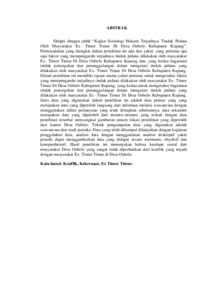 Permasalahan yang diangkat dalam penelitian ini ada dua yakni: yang pertama apa saja faktor yang mempengaruhi terjadinya tindak pidana dilakukan oleh masyarakat Ex-Timor Timur Di Desa Oebelo Kabupaten Kupang dan, yang kedua bagaiman tindak pencegahan dan penanggulangan dalam mengatasi tindak pidana yang dilakukan oleh masyarakat Ex- Timor Timur Di Desa Oebelo Kabupaten Kupang. Dalam penelitian ini memiliki tujuan utama yakni pertama untuk mengetahui faktor yang mempengaruhi terjadinya tindak pidana dilakukan oleh masyarakat Ex- Timor Timur Di Desa Oebelo Kabupaten Kupang, yang kedua untuk mengetahui bagaiman tindak pencegahan dan penanggulangan dalam mengatasi tindak pidana yang dilakukan oleh masyarakat Ex- Timor Timur Di Desa Oebelo Kabupaten Kupang. Jenis data yang digunakan dalam penelitian ini adalah data primer yang yang merupakan data yang diperoleh langsung dari informan melalui wawancara dengan menggunakan daftar pertanyaan yang telah disiapkan sebelumnya, data sekunder merupakan data yang diperoleh dari instansi-instansi yang terkait dengan data penelitian tersebut menyangkut gambaran umum lokasi penelitian yang diperoleh dari kantor Desa Oebelo. Teknik pengumpulan data yang digunakan adalah wawancara dan studi pustaka. Data yang telah dikumpul dilanjutkan dengan kegiatan penggolahan data, analisis data dengan menggunakan analisis deskriptif yakni penulis dapat menggambarkan data yang didapat secara sistematis, obyektif dan komperehensif. Hasil penelitian ini menunjukan bahwa keadaan sosial dari masyarakat Desa Oebelo yang sangat tidak diperhatikan dari konflik yang terjadi dengan masyarakat Ex- Timor Timur di Desa Oebelo.