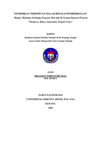 MAU, Fransius Fernando (2025) PENDIDIKAN PEREMPUAN DALAM BINGKAI PEMBERDAYAAN: Kajian Misiologi Terhadap Program Skol bife Di Jemaat Imanuel Postenu Nekamese, Klasis Amanuban Tengah Utara. Undergraduate thesis, Artha Wacana Christian University.