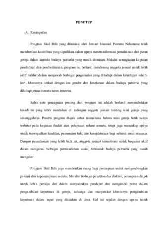 Misi yang inklusif sangat penting untuk mengatasi kesenjangan dan masalah yang ada. Misi ini mencakup orang miskin dan orang kaya, orang yang tertindas dan yang menindas, orang berdosa dan orang benar. Peran gereja tidak hanya berfokus pada kebutuhan rohani, tetapi juga pada kebutuhan jasmani, seperti kemiskinan, kekurangan gizi, dan kurangnya akses terhadap pendidikan dan pekerjaan. Konsep pemberdayaan melibatkan adanya pemberian kekuatan dan otoritas kepada mereka untuk mengembangkan potensi mereka dan menjadi mandiri. Peran gereja adalah memberdayakan mereka yang lemah, miskin, dan tertindas, dan bukan membiarkan sistem patriarki membuat mereka termarjinalkan. Metode yang akan dipakai oleh penulis adalah pendekatan kualitatif. Tujuan dari penelitian ini adalah untuk mengetahui tentang konteks Jemaat Nekamese dan pelaksanaan program Skol Bife serta perspektif misiologi tentang pemberdayaan, dan merumuskan refleksi teologis misiologis berdasarkan perspektif misiologi tentang pemberdayaan berdasarkan pelaksanaan program Skol Bife di jemaat Nekamese Imanuel Postenu, Klasis Amanuban Tengah Utara ; Program Skol Bife yang diprakarsai oleh Jemaat Imanuel Postenu Nekamese telah memberikan kontribusi signifikan dalam mentransformasi pemahaman dan peran gereja dalam budaya patriarki. Program ini telah memberdayakan perempuan untuk mengambil peran kepemimpinan, mempromosikan kesetaraan gender, dan menangani masalah sosial seperti kekerasan dalam rumah tangga dan diskriminasi. Melalui program ini, gereja telah menjadi katalisator perubahan sosial, mempromosikan nilai-nilai keluarga, dan tanggung jawab sosial. Program ini telah menunjukkan bahwa gereja dapat memainkan peran penting dalam mengatasi masalah sosial keadilan, dan kesetaraan. Pada akhirnya, program Skol Bife adalah bukti kekuatan misi inklusif dalam mengubah individu, komunitas, dan masyarakat secara keseluruhan.