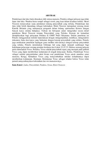 Penderitaan dan luka batin dirasakan oleh semua manusia. Pendeta sebagai pelayan juga tidak luput dari luka. Pendeta harus tampil sebagai sosok yang kuat dalam keadaan terluka. Henri Nouwen menawarkan suatu pemikiran tentang penyembuh yang terluka. Penderitaan dan luka tidak boleh dipandang sebagai kelemahan. Henri Nouwen merupakan seorang imam Katolik Belanda yang mempunyai pengaruh dalam bidang spiritualitas Kristen dengan banyak karya selama hidupnya. Tulisan ini bertujuan untuk mengetahui secara detail pemikiran Henri Nouwen tentang Penyembuh yang Terluka. Konsep ini kemudian diimplikasikan bagi pelayanan Pendeta di GMIT Pniel Sikumana. Dalam penelitian ini Penulis menggunakan metode kepustakaan dengan mengumpulkan, membaca, menganalisis dokumen, buku dan karya yang berkaitan dengan konsep penyembuh yang terluka. Penulis juga melakukan penelitian lapangan guna melihat relevansinya dengan konsep penyembuh yang terluka. Penulis menemukan beberapa hal yang dapat menjadi sumbangsi bagi kehidupan pelayanan seorang pendeta berdasar dari Lukas 22:47-53. Bahwa seorang pelayan perlu meneladani Yesus. Pertama, Yesus adalah penyembuh sejati yang merujuk pada pribadi Yesus yang dapat memberikan kedamaian di tengah kekacauan. Kedua, Penderitaan Yesus sebagai sumber penyembuhan yakni bicara soal penderitaan Yesus untuk menebus umat manusia. Ketiga, Kehadiran Yesus yang menyembuhkan melalui kehadirannya dapat memberikan kedamaian. Keempat, Kerentanan Yesus sebagai teladan bahwa Yesus tidak pernah menyembunyikan kelemahan dan sisi manusiawinya.