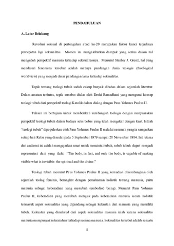 Penulisan skripsi ini bertujuan untuk pertama mengeksplorasi pemahaman para pemuda-pemudi pelaku seks bebas di Jemaat Silo Naikoten 1 tentang tubuh. Kedua menjelaskan makna esensial dari Teologi Tubuh Paus Yohanes Paulus II terhadap para pemuda-pemudi pelaku seks bebas. Penelitian ini memakai metode kualitatif dan terdiri dari 10 sampel terdapat 5 laki-laki dan 5 perempuan. Penulis juga mengkaji dan mendalami berbagai sumber yang berhubungan dengan tema tulisan ini. Hasil penelitian menunjukkan bahwa pemahaman pemuda-pemudi Jemaat Silo Naikoten 1 tentang makna tubuh itu beragam seperti menganggap tubuh sebagai objek pemuas nafsu, penghasil uang, struktur kehidupan. Dimana para pelaku seks bebas melihat kalau tubuh itu di pandang sebagai objek yang bisa untuk memuaskan nafsu badani mereka terlebih lagi mereka juga memandang kalau tubuh itu indah dan bisa diperjual belikan sehingga tidak melihat sebagai sebuah ciptaan Allah yang kudus. Berdasarkan pemahaman Paus Yohanes Paulus II tentang tubuh maka Teologi Tubuh melahirkan sebuah refleksi iman tentang makna seksual manusia. Pemaparan ajaran dalam Teologi Tubuh hendak mengajak umat beriman dan menanggapi berbagai perilaku dan gagasan menyimpang tentang pemahaman umum manusia tentang tubuh dalam perspektif iman. Hakikat tubuh sering diasumsi secara keliru. Tubuh dipandang sebagai objek pemuas seksual dan mengandung unsur komoditi dalam perekonomian. Oleh karena itu hasil analisa dapat disimpulkan bahwa pertama tubuh bukan lagi sebuah objek seksual dan sebagai alat untuk diperjual belikan. Kedua tubuh bukan lagi seonggok daging melainkan tubuh merupakan cara kita untuk berkomunikasi. Karena itu tubuh yang hadir merupakan sebuah kesatuan antara tubuh dengan pribadi ini tergambar dalam bahasa dalam tubuh yang tercetak saat manusia dilahirkan. Tubuh dapat mengungkapkan apa yang tak terlihat menjadi terlihat, sehingga tubuh memiliki nilai keluhuran dan keilahiannya.