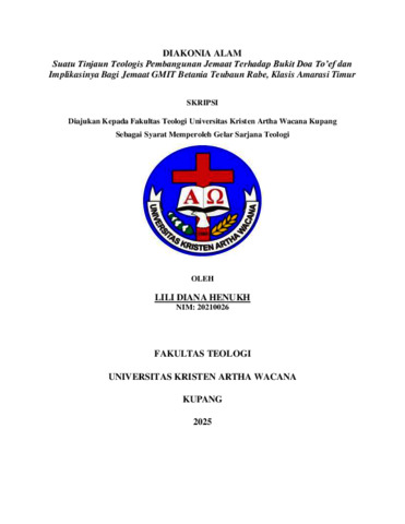 HENUKH, Lili Diana (2025) DIAKONIA ALAM: Suatu Tinjaun Teologis Pembangunan Jemaat Terhadap Bukit Doa To’ef dan Implikasinya Bagi Jemaat GMIT Betania Teubaun Rabe, Klasis Amarasi Timur. Undergraduate thesis, Artha Wacana Christian University.