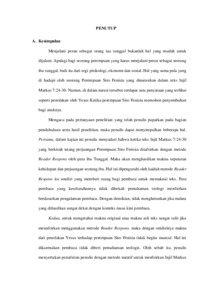Menjalankan peran sebagai seorang ibu tunggal bukanlah hal yang mudah. Tentu ia akan menghadapi berbagai kesulitan baik itu dari segi psikologis, ekonomi dan sosial. Sama halnya dengan apa yang dialami oleh perempuan Siro Fenisia. Maka, penelitian ini bertujuan untuk mengetahui penafsiran teks Injil Markus 7:24-30 dengan metode tafsir Reader Respons. Metode ini menafsirkan makna teks berdasarkan pengalaman pembaca. Sampel penelitian terdiri dari 12 ibu tunggal sebagai pembaca masa kini sekaligus penafsirteks. Hasil penelitian menunjukkan bahwa penafsiran teks Injil Markus 7:24-30 menghasilkan kerygma seputar perjuangan seorang ibu. Maka kerygma yang lahir sangat dekat dengan kehidupan pembaca masa kini. Hal inidisebabkanpengalaman yang dibawa oleh pembaca juga mempengaruhi makna yang dihasilkan. Penulis juga menemukan bahwa penggunakan metode tafsir Reader Respons tidak dapat menemukan makna original dari teks. Hal ini penulis temukan ketika melakukan penafsiran dari dalam teks dengan metode naratif. Selain itu, oleh metodenaratif. Dari kedua metode ini, terdapat dua pesan dari teks Injil Markus 7:24-30 yang lahir oleh pendekatan Reader Respons maupun Naratif yakni “Iman percaya seorang ibu kepada Yesus Kristu smembuahkan pertolongan Tuhan dan Yesus tidak diskriminatif dalam pelayanan-Nya”. Berdasarkan berbagai uraian di atas, penulis menyimpulkan bahwa kedua metode pendekatan ini perlu dilakukan atau diperhatikan secara berimbang untuk memperkaya makna penafsiran suatu teks. Gereja harus belajar dari kisah Perempuan Siro Fenisia ini untuk mengupayakan pelayanan yang menyentuh seluruh ibu tunggal yang ada.