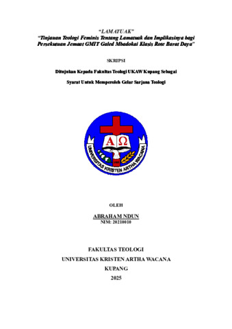 NDUN, Abraham (2025) LAMATUAK: Tinjauan Teologi Feminis Tentang Lamatuak dan Implikasinya bagi Persekutuan Jemaat GMIT Galed Mbadokai Klasis Rote Barat Daya. Undergraduate thesis, Artha Wacana Christian University.