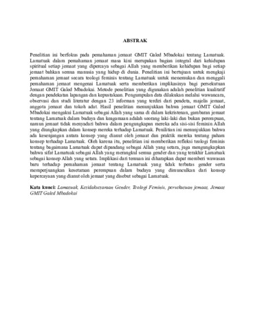 Penelitian ini berfokus pada pemahaman jemaat GMIT Galed Mbadokai tentang Lamatuak. Lamatuak dalam pemahaman jemaat masa kini merupakan bagian integral dari kehidupan spiritual setiap jemaat yang dipercaya sebagai Allah yang memberikan kehidupan bagi setiap jemaat bahkan semua manusia yang hidup di dunia. Penelitian ini bertujuan untuk mengkaji pemahaman jemaat secara teologi feminis tentang Lamatuak untuk menemukan dan menggali pemahaman jemaat mengenai Lamatuak serta memberikan implikasinya bagi persekutuan Jemaat GMIT Galed Mbadokai. Metode penelitian yang digunakan adalah penelitian kualitatif dengan pendekatan lapangan dan kepustakaan. Pengumpulan data dilakukan melalui wawancara, observasi dan studi literatur dengan 23 informan yang terdiri dari pendeta, majelis jemaat, anggota jemaat dan tokoh adat. Hasil penelitian menunjukkan bahwa jemaat GMIT Galed Mbadokai mengakui Lamatuak sebagai Allah yang sama di dalam kekristenan, gambaran jemaat tentang Lamatuak dalam budaya dan keagamaan adalah seorang laki-laki dan bukan perempuan, namun jemaat tidak menyadari bahwa dalam pengungkapan mereka ada sisi-sisi feminin Allah yang diungkapkan dalam konsep mereka terhadap Lamatuak. Penilitian ini menunjukkan bahwa ada kesenjangan antara konsep yang dianut oleh jemaat dan praktik mereka tentang paham konsep terhadap Lamatuak. Oleh karena itu, penelitian ini memberikan refleksi teologi feminis tentang bagaimana Lamatuak dapat dipandang sebagai Allah yang setara, juga mengungkapkan bahwa sifat Lamatuak sebagai Allah yang merangkul semua gender dan yang terakhir Lamatuak sebagai konsep Allah yang setara. Implikasi dari temuan ini diharapkan dapat memberi wawasan baru terhadap pemahaman jemaat tentang Lamatuak yang tidak terbatas gender serta memperjuangkan kesetaraan perempuan dalam budaya yang dimunculkan dari konsep kepercayaan yang dianut oleh jemaat yang disebut sebagai Lamatuak.