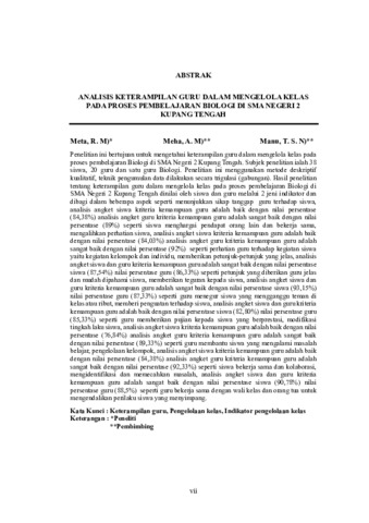 Penelitian ini bertujuan untuk mengetahui keterampilan guru dalam mengelola kelas pada proses pembelajaran Biologi di SMA Negeri 2 Kupang Tengah. Subjek penelitiain inialah 38 siswa, 20 guru dan satu guru Biologi. Penelitian ini menggunakan metode deskripti fkualitatif, teknik pengumulan data dilakukan secara trigulasi (gabungan). Hasil penelitian tentang keterampilan guru dalam mengelola kelas pada proses pembelajaran Biologi di SMA Negeri 2 Kupang Tengah dinilai oleh siswa dan guru melalui 2 jenis indicator dan dibagi dalam beberapaaspek seperti menunjukkan sikap tanggap guru terhadap siswa, analisis angket siswa criteria kemampuan guru adalah baik dengan nilai persentase(84,38%) analisis angket guru criteria kemampuan guru adalah sangat baik dengan nilai persentase (89%) seperti siswa menghargai pendapat orang lain dan bekerjasama, mengalihkan perhatian siswa, analisis angket siswa criteria kemampuan guru adalah baik dengan nilai persentase (84,03%) analisis angket guru criteria kemampuan guru adalah sangat baik dengan nilai persentase (92%) seperti perhatian guru terhadap kegiatan siswa yaitu kegiatan kelompok dan individu, memberikan petunjuk-petunjuk yang jelas, analisis angket siswa dan guru criteria kemampuan guru adalah sangat baik dengan nilai persentase siswa (87,54%) nilai persentase guru (86,33%) seperti petunjuk yang diberikan guru jelas dan mudah dipahami siswa, memberikan teguran kepada siswa, analisis angket siswa dan guru criteria kemampuan guru adalah sangat baik dengan nilai persentase siswa (93,15%) nilai persentase guru (87,33%) seperti guru menegur siswa yang mengganggu teman di kelas atau ribut, member penguatan terhadap siswa, analisis angket siswa dan guru criteria kemampuan guru adalah baik dengan nilai persentase siswa (82,80%) nilai persentase guru (85,33%) seperti guru memberikan pujian kepada siswa yang berprestasi, modifikasi tingkah laku siswa, analisis angket siswa criteria kemampuan guru adalah baik dengan nilai persentase (76,84%) analisis angket guru criteria kemampuan guru adalah sangat baik dengan nilai persentase (89,33%) seperti guru membantu siswa yang mengalami masalah belajar, pengelolaan kelompok, analisis angket siswa criteria kemampuan guru adalah baik dengan nilai persentase (84,38%) analisis angket guru criteria kemampuan guru adalah sangat baik dengan nilai persentase (92,33%) seperti siswa bekerja sama dan kolaborasi, mengidentifikasi dan memecahkan masalah, analisis angket siswa dan guru criteria kemampuan guru adalah sangat baik dengan nilai persentase siswa (90,78%) nilai persentase guru (88,5%) seperti guru bekerja sama dengan wali kelas dan orang tua untuk mengendalikan perilaku siswa yang menyimpang.