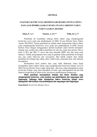 NDUN, Arvan P. (2024) FAKTOR-FAKTOR YANG MEMPENGARUHI KREATIVITAS SISWA PADA JAM PEMBELAJARAN DI SMA SWASTA KRISTEN TARUS TAHUN AJARAN 2023/2024. Undergraduate thesis, Artha Wacana Christian University.