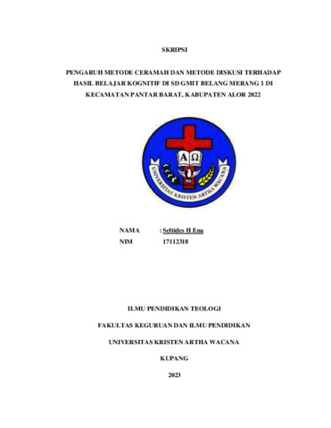 ENA, Seltides (2024) PENGARUH METODE CERAMAHDAN METODE DISKUSI TERHADAP HASIL BELAJAR KOGNITIF DI SD GMIT BELANG MERANG 1 DI KECAMATAN PANTAR BARAT, KABUPATEN ALOR 2022. Undergraduate thesis, Artha Wacana Christian University.
