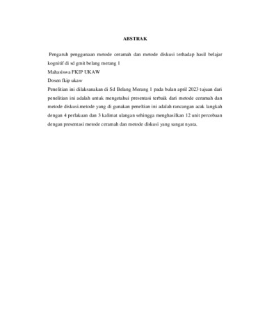 Pengaruh penggunaan metode ceramah dan metode diskusi terhadap hasil belajar kognitif di sd gmit belang merang 1 Mahasiswa FKIP UKAW Dosen fkip ukaw Penelitian ini dilaksanakan di Sd Belang Merang 1 pada bulan april 2023 tujuan dari penelitian ini adalah untuk mengetahui presentasi terbaik dari metode ceramah dan metode diskusi. metode yang di gunakan peneltian ini adalah rancangan acak langkah dengan 4 perlakuan dan 3 kalimat ulangan sehingga menghasilkan 12 unit percobaan dengan presentasi metode ceramah dan metode diskusi yang sangat nyata.