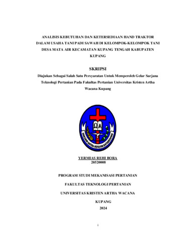 BORA, Yermias Rehi (2024) ANALISIS KEBUTUHAN DAN KETERSEDIAAN HAND TRAKTOR DALAM USAHA TANI PADI SAWAH DIKELOMPOK-KELOMPOK TANI DESA MATA AIR KECAMATAN KUPANG TENGAH KABUPATEN KUPANG. Undergraduate thesis, Artha Wacana Christian University.