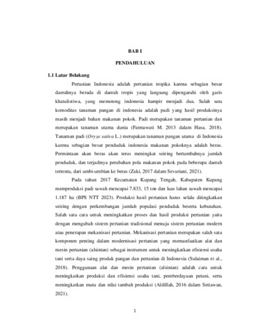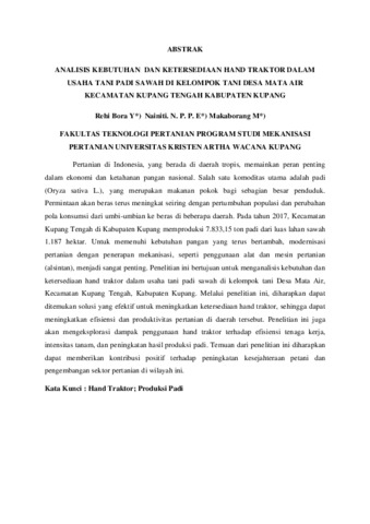 Pertanian di Indonesia, yang berada di daerah tropis, memainkan peran penting dalam ekonomi dan ketahanan pangan nasional. Salah satu komoditas utama adalah padi (Oryza sativa L.), yang merupakan makanan pokok bagi sebagian besar penduduk. Permintaan akan beras terus meningkat seiring dengan pertumbuhan populasi dan perubahan pola konsumsi dari umbi-umbian ke beras di beberapa daerah. Pada tahun 2017, Kecamatan Kupang Tengah di Kabupaten Kupang memproduksi 7.833,15 ton padi dari luas lahan sawah 1.187 hektar. Untuk memenuhi kebutuhan pangan yang terus bertambah, modernisasi pertanian dengan penerapan mekanisasi, seperti penggunaan alat dan mesin pertanian (alsintan), menjadi sangat penting. Penelitian ini bertujuan untuk menganalisis kebutuhan dan ketersediaan hand traktor dalam usaha tani padi sawah di kelompok tani Desa Mata Air, Kecamatan Kupang Tengah, Kabupaten Kupang. Melalui penelitian ini, diharapkan dapat ditemukan solusi yang efektif untuk meningkatkan ketersediaan hand traktor, sehingga dapat meningkatkan efisiensi dan produktivitas pertanian di daerah tersebut. Penelitian ini juga akan mengeksplorasi dampak penggunaan hand traktor terhadap efisiensi tenaga kerja, intensitas tanam, dan peningkatan hasil produksi padi. Temuan dari penelitian ini diharapkan dapat memberikan kontribusi positif terhadap peningkatan kesejahteraan petani dan pengembangan sektor pertanian di wilayah ini.