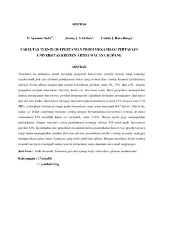 Uncontrolled Keywords: Briket kesambi, biomassa, perekat tepung kanji, kuat tekan, efisiensi pembakaran