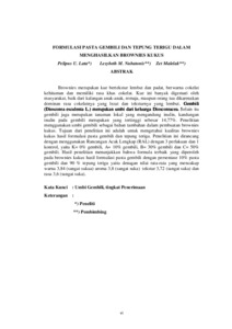 Brownies merupakan kue bertekstur lembut dan padat, berwarna cokelat kehitaman dan memiliki rasa khas cokelat. Kue ini banyak digemari oleh masyarakat, baik dari kalangan anak-anak, remaja, maupun orang tua dikarenakan dominan rasa cokelatnya yang lezat dan teksturnya yang lembut.Gembili (Dioscorea esculenta L.) merupakan umbi dari keluarga Dioscoreacea.Selain itu gembili juga merupakan tanaman lokal yang mengandung inulin,kandungan inulin pada gembili merupakan yang tertinggi sebesar 14,77%. Penelitian menggunakan umbi gembili sebagai bahan tambahan dalam pembuatan brownies kukus.Tujuan dari penelitian ini adalah untuk mengetahui kualitas brownies kukus hasil formulasi pasta gembili dan tepung terigu. Penelitian ini dirancang dengan menggunakan Rancangan Acak Lengkap (RAL) dengan 3 perlakuan dan 1 kontrol, yaitu K= 0% gembili, A= 10% gembili, B= 30% gembilidan C= 50% gembili. Hasil penelitian menunjukkan bahwa formula terbaik yang diperoleh pada brownies kukus hasil formulasi pasta gembili dengan persentase 10% pasta gembili dan 90 % tepung terigu yaitu dengan nilai rata-rata yang mencakup warna 3,84 (sangat sukua) aroma 3,8 (sangat suka) tekstur 3,72 (sangat suka) dan rasa 3,6 (sangatsuka).