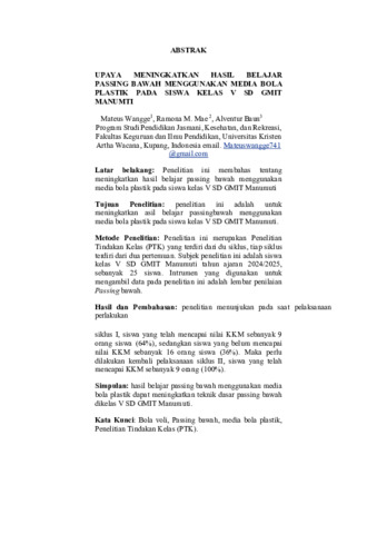 Latar belakang: Penelitian ini membahas tentang meningkatkan hasil belajar passing bawah menggunakan media bola plastik pada siswa kelas V SD GMIT Manumuti Tujuan Penelitian: penelitian ini adalah untuk meningkatkan asil belajar passingbawah menggunakan media bola plastik pada siswa kelas V SD GMIT Manumuti. Metode Penelitian: Penelitian ini merupakan Penelitian Tindakan Kelas (PTK) yang terdiri dari du siklus, tiap siklus terdiri dari dua pertemuan. Subjek penelitian ini adalah siswa kelas V SD GMIT Manumuti tahun ajaran 2024/2025, sebanyak 25 siswa. Intrumen yang digunakan untuk mengambil data pada penelitian ini adalah lembar penilaian Passing bawah. Hasil dan Pembahasan: penelitian menunjukan pada saat pelaksanaan perlakukan siklus I, siswa yang telah mencapai nilai KKM sebanyak 9 orang siswa (64%), sedangkan siswa yang belum mencapai nilai KKM sebanyak 16 orang siswa (36%). Maka perlu dilakukan kembali pelaksanaan siklus II, siswa yang telah mencapai KKM sebanyak 9 orang (100%). Simpulan: hasil belajar passing bawah menggunakan media bola plastik dapat meningkatkan teknik dasar passing bawah dikelas V SD GMIT Manumuti.