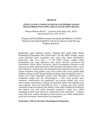 MOSALI, Olfianus M. (2024) TINJAUAN POLA GERAK DASAR DALAM PEMBELAJARAN PENJASORKES PADA SISWA KELAS I DI SD GMIT OESAPA. Undergraduate thesis, Artha Wacana Christian University.