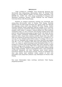 Penelitian ini mengkaji karakteristik morfologi dan morfometrik ikan julung-julung (Hemiramphus lutkei) di Perairan Teluk Kupang. Penelitian dilakukan dari November hingga Desember 2024, dengan sampel ikan diperoleh dari tangkapan nelayan lokal yang didaratkan PPI Oeba, Kupang. Analisis morfologi dilakukan melalui pengamatan langsung terhadap ciri-ciri eksternal, sedangkan pengukuran morfometrik dilakukan menggunakan jangka sorong dan penggaris untuk menilai 11 parameter, termasuk panjang total. Hasil penelitian menunjukkan bahwa H. lutkei di Perairan Teluk Kupang memiliki bentuk tubuh fusiform, mulut berbentuk paruh panjang di bagian bawah, sisik sikloid, dan ekor bercagak. Analisis morfometrik memperlihatkan adanya variasi ukuran antara jantan dan betina, dengan betina umumnya memiliki ukuran tubuh yang sedikit lebih besar. Panjang total spesimen betina berkisar antara 26,7 cm hingga 36,2 cm (rata-rata: 30 cm), sedangkan jantan berkisar antara 27 cm hingga 33,5 cm (rata-rata: 29,8 cm). Simpangan baku tertinggi untuk betina ditemukan pada panjang total (SD = 39,13 cm), sedangkan untuk jantan juga pada panjang total (SD = 23,03 cm). Selain itu, analisis kematangan gonad menunjukkan bahwa H. lutkei bermigrasi ke Perairan Teluk Kupang terutama untuk tujuan reproduksi, dengan persentase tertinggi gonad matang (TKG III-IV) diamati pada bulan November dan Desember. Hal ini menunjukkan bahwa wilayah tersebut berperan penting sebagai tempat pemijahan. Studi ini menyimpulkan bahwa variasi karakteristik morfometrik dipengaruhi oleh faktor lingkungan seperti kondisi perairan, ketersediaan makanan, dan pola migrasi musiman. Temuan ini memberikan data dasar yang penting untuk memahami struktur populasi H. lutkei serta berkontribusi pada pengelolaan perikanan yang berkelanjutan di Perairan Teluk Kupang.