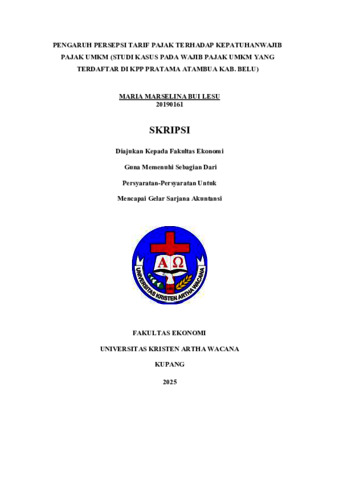 BUI LESU, Maria Marselina (2025) PENGARUH PERSEPSI TARIF PAJAK TERHADAP KEPATUHANWAJIB PAJAK UMKM (STUDI KASUS PADA WAJIB PAJAK UMKM YANG TERDAFTAR DI KPP PRATAMA ATAMBUA KAB. BELU). Undergraduate thesis, Artha Wacana Christian University.