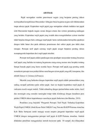 Pajak merupakan sumber penerimaan negara yang berperan penting dalam mewujudkan kesejahteraan Masyarakat. Sebagian besar kegiatan negara sulit dilaksanakan tanpa adanya pajak. Kepatuhan wajib pajak juga merupakan sebuah tindakan taat pajak oleh Masyarakat kepada negara sesuai dengan aturan dan system perundang-undangan yang berlaku. Kepatuhan wajib pajak yang rendah akan mengakibatkan system tersebut tidak berjalan dengan baik, sehingga wajib pajak harus melaksanakan kewajiban pajaknya dengan tidak benar dan pada akhirnya penerimaan dari sektor pajak pun tidak akan tercapai. Persepsi tarif pajak seorang wajib pajak sangat berperan penting dalam mempengaruhi kepatuhan dari wajib pajak tersebut. Persepsi tarif pajak adalah pandangan atau pendapat masyarakat tentang besarnya tarif pajak yang berlaku.ini tentang bagaimana orang-orang merasa atau berpikir tentang berapa banyak pajak yang harus mereka bayar. Persepsi tarif pajak juga penting untuk memahami persepsi masyarakat dalam membangun sistem pajak yang adil, transparan, dan efektif (James S. Coleman & Francis). Masalah yang berkaitan dengan kepatuhan wajib pajak adalah permasalahan yang sedang menjadi perhatian pada sektor pajak. Saat ini tingkat kepatuhan wajib pajak di indonesia masih sangat rendah. Tidak sebanding dengan pertumbuhan usaha mikro, kecil dan menengah yang semakin meningkat tetapi tidak diimbangi dengan kesadaran para pelaku UMKM dalam kepatuhannya membayar pajak (Indarwan dan Binekas, 2018). Penelitian yang berjudul “Pengaruh Persepsi Tarif Pajak Terhadap Kepatuhan Wajib Pajak UMKM (Studi Kasus Pada UMKM Yang Tercatat Di KPP Pratama Atambua Kab. Belu) bertujuan untuk menguji secara empiris pengaruh kepatuhan wajib pajak UMKM dengan menggunakan persepsi tarif pajak di KPP Pratama Atambua. Setelah dilakukan penelitian menggunakan metode kuisioner pada 50 sampel, dan dilanjutkan analisis regresi linear sederhana, hasil uji t pada pengaruh persepsi tarif pajak terhadap kepatuhan wajib pajak UMKM menunjukkan bahwa variable independen berpengaruh secara positif dan signifikan terhadap variable dependen. Dari hasil analisis regresi linear sederhana diperoleh persamaan Y = 39,026 + 0,084 X. Persamaan tersebut menunjukkan bahwa tarif pajak mempunyai arah regresi koefisien positif dengan kepatuhan wajib pajak UMKM sehingga memiliki hubungan yang positif antara persepsi tarif pajak terhadap kepatuhan wajib pajak UMKM yang terdaftar di KPP Pratama Atambua.