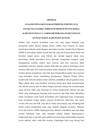 MANUBULU, Ranjes Memitho (2025) ANALISIS PENGARUH KARAKTERISTIK INDIVIDU DAN LINGKUNGAN KERJA TERHADAP PRODUKTIVITAS KERJA KARYAWAN PADA CV. AGROSARI PERSADA DI KECAMATAN KUPANG BARAT, KABUPATEN KUPANG. Undergraduate thesis, Artha Wacana Christian University.