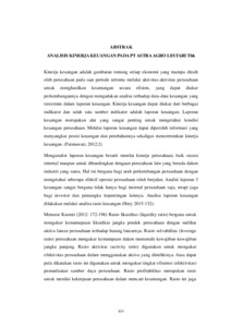 Kinerja keuangan adalah gambaran tentang setiap ekonomi yang mampu diraih oleh perusahaan pada saat periode tertentu melalui aktivitas-aktivitas perusahaan untuk menghasilkan keuntungan secara efisien, yang dapat diukur perkembangannya dengan mengadakan analisa terhadap data-data keuangan yang tercermin dalam laporan keuangan. Kinerja keuangan dapat diukur dari berbagai indikator dan salah satu sumber indikator adalah laporan keuangan. Laporan keuangan merupakan alat yang sangat penting untuk mengetahui kondisi keuangan perusahaan. Melalui laporan keuangan dapat diperoleh informasi yang menyangkut posisi keuangan dan perubahannya sekaligus mencerminkan kinerja keuangan. (Fatmawati, 2012:2) Menganalisi laporan keuangan berarti menilai kinerja perusahaan, baik secara internal maupun untuk dibandingkan dengaan perusahaan lain yang berada dalam industri yang sama. Hal ini berguna bagi arah perkembangan perusahaan dengan mengetahui seberapa efektif operasi perusahaan telah berjalan. Analisi laporan 3 keuangan sangat berguna tidak hanya bagi internal perusahaan saja, tetapi juga bagi investor dan pemangku kepentingan lainnya. Analisa laporan keuangan dilakukan melalui analisa rasio keuangan (Hery 2015:132). Menurut Kasmir (2012: 172-196) Rasio likuiditas (liquidity ratio) berguna untuk mengukur kemamupuan likuiditas jangka pendek perusahaan dengan melihat aktiva lancar perusahaan terhadap hutang lancarnya. Rasio solvabilitas (leverage ratio) perusahaan mengukur kemampuan dalam memenuhi kewajiban-kewajiban jangka panjang. Rasio aktivitas (activity ratio) digunakan untuk mengukur efektivitas perusahaan dalam menggunakan aktiva yang dimilikinya. Atau dapat pula dikatakan rasio ini digunakan untuk mengukur tingkat efisiensi (efektivitas) pemanfaatan sumber daya perusahaan. Rasio profitabilitas merupakan rasio untuk menilai kekmpuan perusahaan dalam mencari keuntungan. Rasio ini juga memberikan ukuran tingkat efektivitas manajemen suatu perusahaan. Hal ini ditunjukkan oleh laba yang dihasilkan dari penjualan dan pendapatan investasi. Dalam penelitian ini metode yang digunakan dalam penelitian ini adalah teknik dokumentasi. Teknik pengumpulan data yang digunakan penelitian adalah teknik dokumentasi yaitu pada penelitian ini peneliti mengumpulkan laporan keuangan tahunan pada PT Astra Agro Lestari Tbk. Populasi dalam penelitian ini ialah populasi data laporan keuangan PT. Astra Agro Lestari Tbk dengan teknik pengambilan sampel menggunakan metode purposive sampling. Purposive sampling adalah teknik penentuan sampel dengan pertimbangan tertentu sehingga diperoleh sampel sebanyak 5 tahun.Teknik analisis yang digunakan dalam penelitian adalah analisis data kuantitatif yang digunakan untuk mengukur CurrentRatio, QuickRatio, CashRatio, Debt To Asset Ratio, Debt To Equity Ratio, Inventory Turnover Ratio, Fixed Assets Turn Over Ratio, NetProfit Margin, Return On Asset Ratio,Retrun On Equity. Hasil penelitian menunjukkan bahwa kinerja keuangan PT. Astra Agro Lestari Tbk periode 2019-2023. Didalam hasil penelitian berdasarkan Rasio Likuiditas Solvabilitas dan Profitabilitas, kinerja keuangan PT.Astra Agro Lestari Tbk pada Rasio Likuiditas mengalami fluktuasi dari tahun 2019-2023 atau ketidak stabilan kinerja keuangan PT. Astra Agro Lestari Tbk. Rasio likuiditas memenuhi kewajiban hutang jangka pendek pada perusahaan PT Astra Agro Lestari Tbk sehingga rasio likuiditas yang tinggi menunjukan kemampuan perusahaan yang baik dalam membayar kewajiban hutang jangka pendek.Pada Rasio Likuiditas dapat dikatakan dalam kondisi baik dengan metode Current Ratio, Quick Ratio dan Cash Ratio yang memenuhi standar industry. Leverage ratio yang semakin tinggi akan sulit mencapai keuntungan sehingga leverage ratio pada PT Astra Agro Lestari dapat dikatakan baik karena perusahaan tidak bergantung pada utang yang berpotensi menyebabkan menurunnya kinerja perusahaan. Pada rasio leverage dapat dikatakan dalam kondisi baik dengan metode Debt To Asset Ratiodan Debt To Equity Ratio walaupun tidak memenuhi standar industri. Rasio aktivitas yang rendah dapat menunjukan bahwa perusahaan memiliki masalah dalam menggunakan sumber daya dananya sehingga PT Astra Agro Lestari Tbk dapat dikatakan perusahaan tidak memanfaatkan asetnya secara efisien dan kurang efektif. Rasio Aktivitas dapat dikatakan dalam kondisi kurang baik dengan metode Inventory Turnover Raio dan Fixed Assets Turn Over yang tidak memenuhi standar industri. Rasio profitabiltas pada PT Astra Agro Lestari Tbk dapat dikatakan tidak memenuhi dikarenakan perusahaan tidak mengelolah aset dengan baik yang membuat menurunnya laba. Pada rasio profitabilitas dapat dikatakan dalam kondisi kurang baik dengan metode Net Profit Margin, return on asset ratio dan Retrun On Equity yang tidak memenuhi standar industri.