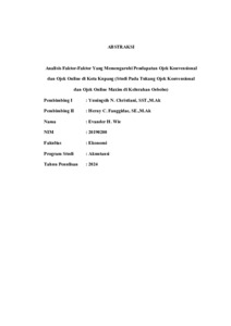 WIE, Evander Holifin (2024) ANALISIS FAKTOR-FAKTOR YANG MEMPENGARUHI PENDAPATAN OJEK KOVENSIONAL DAN OJEK ONLINE DI KOTA KUPANG: (Studi Pada Tukang Ojek Konvensional dan Tukang Ojek Online Maxim di Kelurahan Oebobo). Undergraduate thesis, Artha Wacana Christian University.