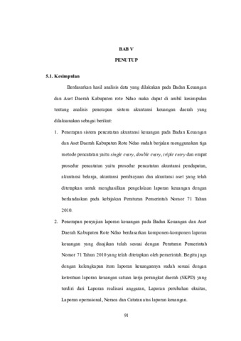 Sistem akuntansi keuangan daerah adalah metode dan prosedur mencatat dan melaporkan informasi keuangan yang disediakan bagi pemerintah daerah dan pemangku kepentingan di perusahaan organisasi nonlaba. Metode pencatatan akuntansi keuangan daerah yaitu, singel entry adalah transaksi yang mengakibatkan pemasukan kas akan masuk dalam sisi penerimaan sedangkan yang mengurai kas dimasukan dalam sisi pengeluaran, doble entry adalah pencatatan dengan sisi debit dan sisi kredit serta harus menjaga keseimbangan dasar akuntansi dan triple entry adalah pelaksanaan pencatatan dengan menggunakan sistem doble entry ditambah dengan pencatatan pada buku anggaran. Prosedur pencatatan akuntansi keuangan pemerintah yaitu, prosedur akuntansi pendapatan ini tidak hanya sebatas dari penjualan barang hasil produksi saja, melainkan ada banyak sumber lainya. Namun tidak berjalan begitu saja tetapi ada pertanggunjawaban oleh transaksi pendapatan di Pejabat Pengelola Keuangan Daerah (PPKD) yang dicatat oleh fungsi akuntansi PPKD. Prosedur Pencatatan Akuntansi Belanja pencatatan transaksi ini dicatat saat pengesahan SPJ bila menggunakan SP2D UP/GU/TU atau pada saat menerima SP2D LS oleh sebab itu, Pejabat Pengelola Keuangan Daerah (PPKD) dicatat oleh fungsi akuntansi PPKD. Prosedur Pencatatan Akuntansi Pembiayaan mencatat transaksi keuangan pemerintahan terkait penerima dan pengeluaran pembiayaan, seperti pinjaman, obligasi, penyertaan modal dan dana cadangan. Fungsi akuntansi mencatat transaksi tersebut ke buku besar dan laporan keuangan untuk memenuhi ketentuan akuntansi pemerintah. Hal itu dicatat dan diakui pada saat diterima pada rekening kas daerah. Kemudian transaksi pengeluaran pembiayaan diakui pada saat dikeluarkan dari rekening kas daerah. Prosedur Pencatatan Akuntansi Aset aset pada akuntansi Pejabat Pengelola Keuangan Daerah (PPKD) melakukan pencatatan atas pengakuan aset yang muncul dari transaksi pembiayaan yang dilakukan oleh Pemda. Berdasarkan bukti yang ada, fungsi akuntansi PPKD membuat bukti memorial yang memuat informasi tentang jenis/nama aset, kode rekening terkait, nilai aset dan tanggal transaksi. Bukti memorial tersebut akan dipakai sebagai dasar pencatatan jurnal oleh fungsi akuntansi PPKD untuk laporan keuangan mengambarakan posisi keuangan suatu perusahaan yang diperoleh dari proses akuntansi dan menghasilkan informasi keuangan, informasi tersebut digunakan manajemen perusahaan serta pihak-pihak tertentu yang memiliki kepentingan dengan informasi tersebut. Organisasi nonlaba di Indonesia hanya mengarahkan perhatiannya pada kualitas program dan kurang memperhatikan tentang penyajian laporan keuangan. Sedangkan dalam praktiknya, sistem pengelolaan keuangan yang baik akan menjadi penanda utama akuntabilitas dan transparasi di sebuah lembaga. Interpretasi Peraturan Pemerintah (PP No 71 Tahun 2010) yang mengatur penyajian laporan keuangan untuk pemerintah daerah. Interprestasi Standar Akuntansi Keuangan Pemerintah (Peraturan Pemerintah No 71 Tahun 2010) menjadi acuan atau standar dalam membuat laporan keuangan pemerintah daerah berdasarkan PP No 71 Tahun 2010, antara lain: Laporan realisasi anggaran, Laporan neraca, Laporan operasional, Laporan perubahan ekuitas dan Catatan atas laporan keuangan. Tujuan dari penelitian ini untuk mengetahui penerapan sistem pencatatan akuntansi keuangan dan penerapan penyajian laporan keuangan pada Badan Keuangan dan Aset Daerah Kabupaten Rote Ndao dengan Peraturan Pemerintah Nomor 71 Tahun 2010. Penelitian ini menggunakan pendekatan deskriptif kualitatif yang ditunjukan dengan mendiskripsikan data yang diperoleh berdasarkan konsep dan indikator yang telah dijelaskan pada bagian terdahulu. Penelitian ini menggunakan teknik pengumpulan data, dokumentasi dan wawancara. Hasil penelitian ini menunjukan bahwa penerapan sistem pencatatan akuntansi keuangan dan penyajian laporan keuangan pada Badan Keuangan dan Aset Daerah Kabupaten Rote Ndao sudah berjalan sesuai dengan Peraturan Pemerintah Nomor 71 Tahun 2010 menggunakan tiga metode pencatatan akuntansi keuangan daerah yaitu single entry, double entry, triple entry dan empat prosedur pencatatan akuntansi pemerintah yaitu prosedur pencatatan akuntansi pendapatan, akuntansi belanja, akuntansi pembiayaan dan akuntansi aset yang telah ditetapkan untuk menghasilkan pengelolaan penyajian laporan keuangan berdasarkan komponen-komponen dengan kelengkapan item laporan keuangannya sudah sesuai dengan ketentuan laporan keuangan satuan kerja perangkat daerah (SKPD) yang terdiri dari Laporan realisasi anggaran, Laporan perubahan ekuitas, Laporan operasional, Neraca dan Catatan atas laporan keuangan.