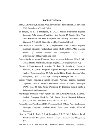 Laporan keuangan merupakan gambaran posisi keuangan suatu perusahaan yang diperoleh dari proses akuntansi dan menghasilkan informasi keuangan, informasi tersebut digunakan manajemen perusahaan serta pihak-pihak tertentu yang memiliki kepentingan dengan informasi tersebut. Organisasi nonlaba di Indonesia hanya mengarahkan perhatiannya pada kualitas program dan kurang memperhatikan tentang penyajian laporan keuangan. Sedangkan dalam praktiknya. Sistem pengelolaan keuangan yang baik akan menjadi penanda utama akuntabilitas dan transparasi di sebuah lembaga. Interpretasi Standar Akuntansi Keuangan (ISAK 35) yang mengatur penyajian laporan keuangan untuk organisasi nonlaba. Interprestasi Standar Akuntansi Keuangan (ISAK 35) menjadi acuan atau standar dalam membuat laporan keuangan organisasi nonlaba berdasarkan ISAK 35, antara lain: Laporan posisi keuangan, Laporan penghasilan komprehensif, Laporan perubahan aset neto, Laporan arus kas, Catatan atas laporan keuangan. Tujuan dari penelitian ini untuk mengetahui kesesuaian laporan keuangan GMIT Jemaat Betel Oefafi dengan Interprestasi Standar Akuntansi Keuangan (ISAK 35). Penelitian ini menggunakan pendekatan deskriptif kualitatif yang ditunjukan dengan mendiskripsikan data yang diperoleh berdasarkan konsep dan indikator yang telah dijelaskan pada bagian terdahulu. Penelitian ini menggunakan teknik pengumpulan data, dokumentasi dan wawancara. Hasil penelitian ini menunjukan kesesuaian masing-masing akun laporan keuangan GMIT Jemaat Betel Oefafi dengan laporan keuangan Interprestasi Standar Akuntansi Keuangan (ISAK 35) ditemukan bahwa ada beberapa akun dari laporan keuangan Interprestasi Standar Akuntansi Keuangan (ISAK 35) yang sesuai dan yang sudah di catat pada laporan keuangan GMIT Jemaat Betel Oefafi. Namun GMIT Jemaat Betel Oefafi belum menerapkan laporan keuangan Interprestasi Standar Akuntansi Keuangan (ISAK 35) di GMIT Jemaat Betel Oefafi di karenakan masih kurangnya pemahaman mengenai Interprestasi Standar Akuntansi Keuangan (ISAK 35).