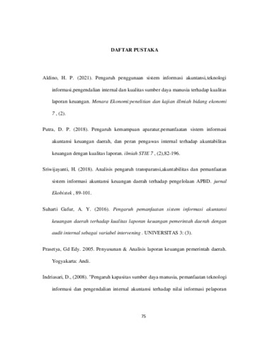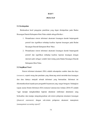 SEUK, Dandi Youso (2024) PENGARUH PEMANFAATAN SISTEM INFORMASI AKUNTANSI KEUANGAN DAERAH TERHADAP KUALITAS LAPORAN KEUANGAN DENGAN INTERNAL AUDIT SEBAGAI VARIABEL INTERVENING PADA BADAN KEUANGAN KABUPATEN ROTE NDAO. Undergraduate thesis, Artha Wacana Christian University.