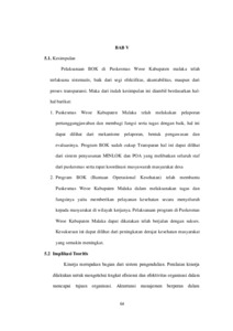 Penelitian ini menggunakan penelitian deskriptif yang menggunakan metode kualitatif. Dengan tujuan untuk mengetahui tingkat akuntabilitas dan transparansi pengelolaan dana dan untuk mengetahui efektivitas kinerja pemberian dana program bantuan operasional kesehatan di Puskesmas weoe Kabupaten Malaka. Jenis data yang digunakan yaitu data primer berupa wawancara dengan observasi atau pengamatan langsung di lapangan dan data sekunder berupa laporan keuangan puskesmas weoe. Hasil penelitian ini menunjukkan :1). Program Bantuan Operasional Kesehatan sudah cukup transparan hal ini dapat dilihat dari mini lokakarya dan POA yang melibatkan seluruh staf dari puskesmas dan kader puskesmas setempat. 2). Pelaksanaan dari program di puskesmas weoe dapat dikatakan telah berjalan dengan sukses dan untuk efektivitas kinerja di puskesmas weoe sudah cukup efektif. Menurut undang undang No.39 tahun 2009 tentang kesehatan, kesehatan adalah keadaan sehat, baik secara fisik, mental,spiritual maupun sosial yang memungkinkan setiap otrang hidup produktif secara sosial dan ekonomis. Di mana di sumber daya di bidang kesehatannya adalah segalah bentuk dana, tenaga, pembekalan kesehatan, sedian farmasi dan alat kesehatan serta fasilitas pelayanan kesehatan dan teknologi yang di manfaatkan untuk menyelenggarakan upaya kesehatan yang di lakukan oleh pemerintah daerah atau masyarakat. Dalam upaya meningkatkan derajat kesehatan masyarakat, kementrian kesehatan terus berupaya untuk meningkatkan akses masyarakat terhadap pelayanan ksehatan yang bermutu. Namun didasari dari bahwa pembangunan kesehatan masih menghadapi berbagai tantangan, antara lain masih terjadinya kesenjangan status kesehatan masyarakat antar wilayah, antar status sosial dan 2 ekonomi, muncul berbagai masalah kesehatan/penyakit baru (new emerging deseases) atau penyakit lama yang muncul kembali (re emerging deseases). Kesehatan merupakan investasi untuk mendukung pembangunan ekonomi serta memiliki peran penting dalam upaya penanggulangan kemiskinan. Pembangunan kesehatan harus dipandang sebagai investasi untuk meningkatkan kualitas sumber daya manusia. Dalam pengukuran Indeks Pembangunan Manusia (IPM), kesehatan adalah salah satu komponen utama selain pendidikan dan pendapatan Elfindri (2011) Pemerintah berfokus dalam pembangunan dan pengembangan di bidang pelayanan kesehatan dalam kurun waktu lima tahun terakhir, karena dapat membawa dampak positif dalam kehidupan masyarakat banyak. Tujuan organisasi lebih berfokus pada pelayanan, kepuasan pasien, dan kesehatan masyarakat. Selain itu juga memiliki tujuan keuangan sehingga untuk mencapai suatu tujuan di butuhkan profesi akuntansi untuk menghasilkan informasi akuntansi, pengembalian keputusan, pengendalian dan akuntabilitas. Sejalan dengan National Summit 2009 maka pemerintah akan memberikan perhatian lebih pada perluasan jaminan kesehatan, penekanan pada upaya promotif-preventif, dan penanggulangan penyakit dan percepatan untuk pencapaian MDG’s Kemenkes (2010). Millennium Development Goals (MDGs) atau tujuan pembangunan millennium pada tahun 2015 adalah mewujudkan kesejahteraan penduduk, tujuan bersama dalam MDGs tersebut terdiri dari 8 tujuan yang meliputi: 1) Menanggulangi kemiskinan dan kelaparan. 2) Mencapai pendidikan dasar untuk semua.3) Mendorong kesetaraan gender dan pemberdayaan perempuan. 4) Menurunkan angka kematian anak. 5) Meningkatkan kesehatan ibu. 6) Memerangi penyebaran HIV/AIDS, malaria,dan penyakit menular lainnya. 7) Kelestarian lingkungan hidup. 8) Membangun kemitraan global dalam pembangunan. Dari 8 tujuan MDGs tersebut, 5 di antaranya adalah MDGs yang terkait langsung dengan bidang kesehatan yaitu MDGs 1, 4, 5, 6, dan 7. Perlu diketahui bahwa tidak semua kabupaten atau kota mempunyai kecukupan anggaran untuk membiayai pembangunan kesehatan, khususnya di puskesmas. Peran puskesmas disini sangat penting karena menjadi ujung tombak dalam upaya pelayanan kesehatan di masyarakat, terutama upaya promotif dan preventif. Pusat kesehatan masyarakat (Puskesmas) Weoe, Kecamatan Wewiku, Kabupaten Malaka”.Puskesmas Weoe memiliki tugas untuk merumuskan kebijakan kesehatan, melaksanakan bidang kesehatan,melaksanakan evalusasi dan pelaporan bidang kesehatan, melaksanakan administrasi kesehatan,melaksanakan fungsi lain yang berkaitan dengan urusan kesehatan.Selain fungsi-fungsi tersebut,melalaui puskesmas ini juga pemerintah bertanggung jawab untuk melakukan pengarahan kesehatan,pengarahan hidup sehat dengan olahraga dan kesehatan jiwa bagi masyarakat serta keluarga.puskesmas ini juga bertugas sebagai penjamin dan pengawas fasilitas kesehatan diwilayah kerjanya. Dari segi efektifitas dukungan dana operasional APBD ditarik untuk digantikan dengan Bantuan Operasional Kesehatan (BOK) dan adanya beberapa Kabupaten/Kota yang mengutamakan program-program yang menyerap APBD lebih dulu di bandingkan dengan program Bantuan Operasional Kesehatan (BOK) akibatnya dalam pencapaian pelaksanaan program Bantuan Operasional Kesehatan (BOK) menjadi tidak maksimal. Dari segi akuntabilitas dan transparansi terdapat banyak kendala antara lain kualitas Plan Of Action (POA) yang tersusun belum standar, terbatasnya jumlah tenaga pengelola keuangan sehingga penggabungan pengelolaan Bantuan Operasional Kesehatan (BOK) dengan jaminan Kesehatan Masyarakat (Jamkesmas) menjadi beban dan membingungkan, dominasi program tertentu dalam penggunaan dana Bantuan Operasional Kesehatan (BOK) yang disebabkan kurangnya koordinasi antar program. Hal senada dikemukakan oleh Faisal (2012), bahwa hambatan-hambatan dijumpai dalam pelaksanaan BOK adalah kesalahan administrasi pelaporan terkait Surat Pertanggung Jawaban (SPJ), ketidak sesuaian antara program dengan POA (Plan Of Action), ketidak pahaman puskesmas tentang sistem keuangan Bantuan Operasional Kesehatan (BOK) dan keterbatasan Sumber Daya Manusia (SDM) Puskesmas. Menurut Setiawan (2009), sedikitnya ada empat hal yang harus diperhatikan dalam pengguna dana Bantuan Operasional yai