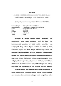 COSTA, Yulyanti Teorida DA (2024) ANALIS FAKTOR-FAKTOR YANG MEMPENGARUHI HARGA SAHAM PERUSAHAAN LQ45 DI BURSA EFEK INDONESIA: (Studi Pada Perusahaan Yang Terdaftar Di LQ45 Tahun 2022-2023). Undergraduate thesis, Artha Wacana Christian University.