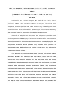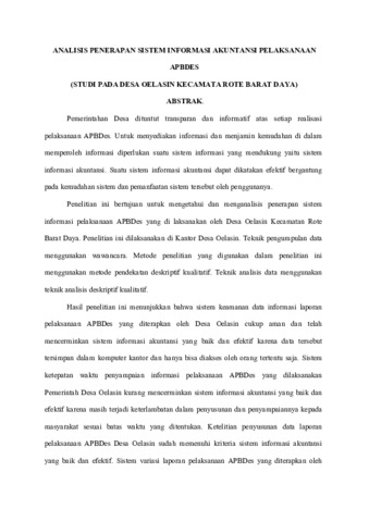 Pemerintahan Desa dituntut transparan dan informatif atas setiap realisasi pelaksanaan APBDes. Untuk menyediakan informasi dan menjamin kemudahan di dalam memperoleh informasi diperlukan suatu sistem informasi yang mendukung yaitu sistem informasi akuntansi. Suatu sistem informasi akuntansi dapat dikatakan efektif bergantung pada kemudahan sistem dan pemanfaatan sistem tersebut oleh penggunanya. Penelitian ini bertujuan untuk mengetahui dan menganalisis penerapan sistem informasi pelaksanaan APBDes yang di laksanakan oleh Desa Oelasin Kecamatan Rote Barat Daya. Penelitian ini dilaksanakan di Kantor Desa Oelasin. Teknik pengumpulan data menggunakan wawancara. Metode penelitian yang digunakan dalam penelitian ini menggunakan metode pendekatan deskriptif kualitatif. Teknik analisis data menggunakan teknik analisis deskriptif kualitatif. Hasil penelitian ini menunjukkan bahwa sistem keamanan data informasi laporan pelaksanaan APBDes yang diterapkan oleh Desa Oelasin cukup aman dan telah mencerminkan sistem informasi akuntansi yang baik dan efektif karena data tersebut tersimpan dalam komputer kantor dan hanya bisa diakses oleh orang tertentu saja. Sistem ketepatan waktu penyampaian informasi pelaksanaan APBDes yang dilaksanakan Pemerintah Desa Oelasin kurang mencerminkan sistem informasi akuntansi yang baik dan efektif karena masih terjadi keterlambatan dalam penyusunan dan penyampaiannya kepada masyarakat sesuai batas waktu yang ditentukan. Ketelitian penyusunan data laporan pelaksanaan APBDes Desa Oelasin sudah memenuhi kriteria sistem informasi akuntansi yang baik dan efektif. Sistem variasi laporan pelaksanaan APBDes yang diterapkan oleh Pemerintahan Desa Oelasin sudah mencerminkan sistem informasi akuntansi yang baik dan efektif. Sistem relevansi data yang dihasilkan dan dilaporkakan oleh Pemerintah Desa Oelasin terkait dengan pelaksanaan APBDes sudah mencerminkan sistem informasi akuntansi yang baik dan efektif karena data yang dilaporkan sangat relevan dengan data anggaran yang sahkan, hal ini dapat dilihat dari sisa anggaran yang dianggarkan dalam APBDes tidak jauh berbeda dengan realisasi pelaksaan APBDes yang ditetapkan. Berdasarkan hasil penelitian tersebut disarankan kepada Pemerintahan Desa Oelasin untuk melakukan pelatihan khusus kepada aparatur desa yang bertugas untuk menyusun laporan pelaksanaan APBDes dan meningkatkan koordinasinya dalam menyusun laporan pelaksanaan APBDes.