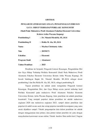 ADOE, Meylna Christanty (2025) PENGARUH LITERASI KEUANGAN, PENGENDALIAN DIRI DAN GAYA HIDUP TERHADAP PERILAKU KONSUMTIF: (Studi Pada Mahasiswa Prodi Akuntansi Fakultas Ekonomi Universitas Kristen Artha Wacana Kupang). Undergraduate thesis, Artha Wacana Christian University.