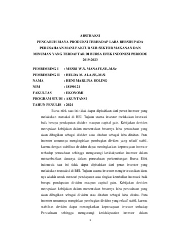 BOLING, Heni Marlina (2024) PENGARUH BIAYA PRODUKSI TERHADAP LABA BERSIH PADA PERUSAHAAN MANUFAKTUR SUB SEKTOR MAKANAN DAN MINUMAN YANG TERDAFTAR DI BURSA EFEK INDONESIA PERIODE 2019-2023. Undergraduate thesis, Artha Wacana Christian University.