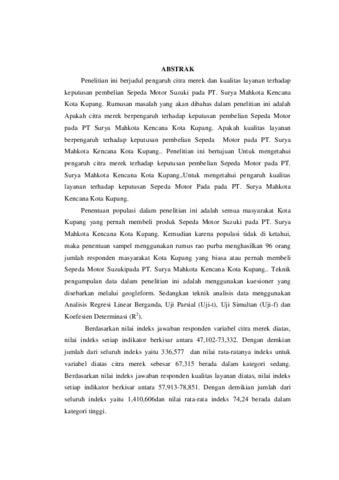 Penelitian ini berjudul pengaruh citra merek dan kualitas layanan terhadap keputusan pembelian Sepeda Motor Suzuki pada PT. Surya Mahkota Kencana Kota Kupang. Rumusan masalah yang akan dibahas dalam penelitian ini adalah Apakah citra merek berpengaruh terhadap keputusan pembelian Sepeda Motor pada PT Surya Mahkota Kencana Kota Kupang. Apakah kualitas layanan berpengaruh terhadap keputusan pembelian Sepeda Motor pada PT. Surya Mahkota Kencana Kota Kupang. Penelitian ini bertujuan Untuk mengetahui pengaruh citra merek terhadap keputusan pembelian Sepeda Motor pada PT. Surya Mahkota Kencana Kota Kupang.,Untuk mengetahui pengaruh kualitas layanan terhadap keputusan Sepeda Motor Pada pada PT. Surya Mahkota Kencana Kota Kupang. Penentuan populasi dalam penelitian ini adalah semua masyarakat Kota Kupang yang pernah membeli produk Sepeda Motor Suzuki pada PT. Surya Mahkota Kencana Kota Kupang. Kemudian karena populasi tidak di ketahui, maka penentuan sampel menggunakan rumus rao purba menghasilkan 96 orang jumlah responden masyarakat Kota Kupang yang biasa atau pernah membeli Sepeda Motor Suzukipada PT. Surya Mahkota Kencana Kota Kupang. Teknik pengumpulan data dalam penelitian ini adalah menggunakan kuesioner yang disebarkan melalui geogleform. Sedangkan teknik analisis data menggunakan Analisis Regresi Linear Berganda, Uji Parsial (Uji-t), Uji Simultan (Uji-f) dan Koefesien Determinasi (R2). Berdasarkan nilai indeks jawaban responden variabel citra merek diatas, nilai indeks setiap indikator berkisar antara 47,102-73,332. Dengan demkian jumlah dari seluruh indeks yaitu 336,577 dan nilai rata-ratanya indeks untuk variabel diatas citra merek sebesar 67,315 berada dalam kategori sedang. Berdasarkan nilai indeks jawaban responden kualitas layanan diatas, nilai indeks setiap indikator berkisar antara 57,913-78,851. Dengan demikian jumlah dari seluruh indeks yaitu 1,410,606dan nilai rata-rata indeks 74,24 berada dalam kategori tinggi. Berdasarkan hasil persamaan regresi linear berganda Y = 3,580 + 0,316 X1 + 0,153 X2. Diketahui konstan regresi sebesar 3,580, koefisien regresinya b1 = 0,316, koefisien regresi b2 = 0,153. Nilai konstan sebesar 3,580 artinya jika citra merek (X1), kualitas layanan (X2) sama dengan nol , maka keputusan pembelian (Y) memiliki nilai sebesar 3,580 satuan. Koefisien regresi (b1) sebesar 0,316 artinya jika nilai citra merek (X1) mengalami kenaikan sebesar satu satuan , maka keputusan pembelian (Y) akan meningkat sebesar 0,316 satuan. Koefisien regresi bernilai positif artinya terdapat pengaruh positif citra merek (X1) terhadap keputusan pembelian (Y). Koefisien regresi (b2) sebesar 0,153 artinya jika kualitas layanan (X2) mengalami kenaikan sebesar satu satuan, maka keputusan pembelian (Y) akan meningkat sebesar 0,153 satuan. Koefisien regresi bernilai positif artinya terdapat pengaruh positif kualitas layanan (X2) terhadap keputusan pembelian (Y). Implikasi Terapan: Berdasarkan hasil penelitian diatas, maka peneliti dapat mengemukakan beberapa masukan sebagai berikut: Dengan diketahui bahwa variabel citra merek pada Sepeda Motor Suzuki pada PT. Surya Mahkota Kencana Kota Kupang perlu ditingkatkan dalam hal memberikan ciri-ciri yang membedakannya dari merek lain dalam hal kreativitas, dinamis dan kekokohan pada merek sepeda motor Suzuki. Dengan diketahui bahwa variabel kualitas layanan pada PT. Surya Mahkota Kencana Kota Kupang.patut dipertahankan, namun ada yang perlu ditingkatkan dalam hal penampilan petugas saat melayani konsumen yang membeli produk sepeda Motor Suzuki pada PT. Surya Mahkota Kencana Kota Kupang. Bagi peneliti selanjutnya, disarankan agar meneliti lebih jauh lagi tentang indikator keputusan pembelian pada indikator jumlah pembelian, karena memiliki nilai indeks dalam kategori sedang. Hasil penelitianini menunjukkan bahwa secara parsial citra merek berpengaruh positif dan signifikan terhadap keputusan pembelian Sepeda Motor Suzukipada PT. Surya Mahkota Kencana Kota Kupang, secara parsial kualitas layanan berpengaruh posistif dan signifikan terhadap keputusan pembelian Sepeda Motor Suzuki Kuanino pada PT. Surya Mahkota Kencana Kota Kupang, dan secara simultan citra merek, kualitas layanan berpengaruh sama-sama terhadap keputusan pembelian Sepeda Motor Suzuki pada PT. Surya Mahkota Kencana Kota Kupang.