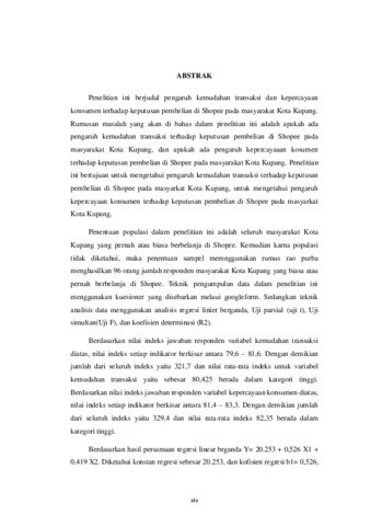 Penelitian ini berjudul pengaruh kemudahan transaksi dan kepercayaan konsumen terhadap keputusan pembelian di Shopee pada masyarakat Kota Kupang. Rumusan masalah yang akan di bahas dalam penelitian ini adalah apakah ada pengaruh kemudahan transaksi terhadap keputusan pembelian di Shopee pada masyarakat Kota Kupang, dan apakah ada pengaruh kepercayaaan kosumen terhadap keputusan pembelian di Shopee pada masyarakat Kota Kupang. Penelitian ini bertujuan untuk mengetahui pengaruh kemudahan transaksi terhadap keputusan pembelian di Shopee pada masyarkat Kota Kupang, untuk mengetahui pengaruh kepercayaan konsumen terhadap keputusan pembelian di Shopee pada masyarkat Kota Kupang. Penentuan populasi dalam penelitian ini adalah seluruh masyarakat Kota Kupang yang pernah atau biasa berbelanja di Shopee. Kemudian karna populasi tidak diketahui, maka penentuan sampel memnggunakan rumus rao purba menghasilkan 96 orang jumlah responden masyarakat Kota Kupang yang biasa atau pernah berbelanja di Shopee. Teknik pengumpulan data dalam penelitian ini menggunakan kuesioner yang disebarkan melaui googleform. Sedangkan teknik analisis data menggunakan analisis regresi linier berganda, Uji parsial (uji t), Uji simultan(Uji F), dan koefisien determinasi(R2). Berdasarkan nilai indeks jawaban responden variabel kemudahan transaksi diatas, nilai indeks setiap indikator berkisar antara 79,6 – 81,6. Dengan demikian jumlah dari seluruh indeks yaitu 321,7 dan nilai rata-rata indeks untuk variabel kemudahan transaksi yaitu sebesar 80,425 berada dalam kategori tinggi. Berdasarkan nilai indeks jawaban responden variabel kepercayaan konsumen diatas, nilai indeks setiap indikator berkisar antara 81,4 – 83,3. Dengan demikian jumlah dari seluruh indeks yaitu 329,4 dan nilai rata-rata indeks 82,35 berada dalam kategori tinggi. Berdasarkan hasil persamaan regresi linear brganda Y= 20.253 + 0,526 X1 + 0,419 X2. Diketahui konstan regresi sebesar 20.253, dan kofisien regresi b1= 0,526, koefisien regresi b2= 0,419. Nilai konstan sebesar 20.253 artinya jika nilai kemudahan transaksi (X1), kepercayaan konsumen (X2) sama dengan nol, maka keputusan pembelian (Y) memiliki nilai sebesar 20.253 satuan. Koefesien regresi (b1) sebesar 0,526 artinya jika nilai kemudahan transaksi (X1) mengalami kenaikan sebesar satu satuan, maka keputusan pembelian (Y) akan meningkat sebesar 0,526 satuan. Koefisien regresi bernilai positif artinya terdapat pengaruh positif kemudahan transaksi (X1) terhadap keputusan pembelian (Y). Koefesien regresi (b2) sebesar 0,419 artinya jika kepercayaan konsumen (X2) mengalami kenaikan sebesar satu satuan, maka keputusan pembelian (Y) akan meningkat sebesar 0,419 satuan. Koefisien regresi bernilai positif, artinya terdapat pengaruh positif kepercayaan konsumen (X2) terhadap keputusan pembelian (Y). Implikasi Terapan: Berdasarkan hasil penelitian di atas, maka peneliti dapat mengemukakan beberapa masukan sebagai berikut. Dengan diketahui bahwa variabel kemudahan transaksi pada pada Shopee di kategori baik dan terlihat bahwa semua indikator variabel kemudahan transaksi mendapatkan respon yang baik maka hal ini perlu di pertahankan bahkan di tingkatkan. Karena adanya pilihan transaksi tersebut, maka konsumen akan mempertimbangkan untuk melakukan keputusan pembelian. Dengan diketahui bahwa variabel kepercayaan konsumen pada Shopee di kategori baik dan terlihat bahwa semua indikator kepercayaan konsumen mendapatkan respon yang baik maka hal ini perlu dipertahankan bahkan ditingkatkan. Kemudian bagi konsumen yang ingin melakukan pembelian dishopee harus melihat ulasan positif dan negatif dari konsumen terdahulu tentang produk yang ingin dibeli, karena adanya ulasan tersebut, mampu menjadi pertimbangan bagi konsumen dalam melakukan keputusan pembelian. Dengan diketahui bahwa variabel keputusan pembelian pada Shopee di kategori baik dan terlihat bahwa semua indikator keputusan pembelian mendapatkan respon yang baik maka hal ini perlu dipertahankan bahkan ditingkatkan. Hasil penelitian ini menunjukkan bahwa secara parsial kemudahan transaksi berpengaruh positif dan signifikan terhadap keputusan pembelian di Shopee pada masyarakat Kota Kupang, secara parsial kepercayaan konsumen berpengaruh positif dan signifikan terhadap keputusan pembelian di shopee pada masyarakat Kota Kupang, dan secara simultan kemudahan transaksi, dan kepercayaan konsumen berpengaruh secara bersama-sama terhadap keputusan pembelian di Shopee pada masyarakat Kota Kupang.