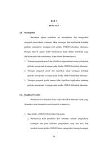 Usaha Mikro, Kecil dan Menengah yang biasa disebut juga dengan UMKM merupakan unit usaha yang berdiri sendiri dan dikelola oleh perorangan maupun kelompok. Bentuk UMKM dapat berupa perusahaan perseorangan, persekutuan, maupun perseroan terbatas. Kontribusi usaha mikro, kecil dan menengah (UMKM) di Indonesia tidak perlu diragukan lagi. Sejak adanya krisis ekonomi yang melanda bangsa Indonesia tahun 1998 silam, terbukti bahwa sektor UMKM mampu berdiri tegak bertahan dalam menghadapi krisis tersebut hingga sampai saat ini. Berdasarkan tabel 1.13 dapat dilihat bahwa angka signifikan sebesar 0,00 dengan nilai f_hitung sebesar 158,509. f_tabel dengan degree of freedom df2 =n-k = 43-4= 39, a =5%, maka diperoleh f_tabel =2,85. Jika nilai f_hitung>f_tabel, maka Ho ditolak dan Ha diterima, dan jika f_hitung<f_tabel Maka Ho diterima dan Ha ditolak. Hasilnya nilai f (hitung )> 158,509 > f_tabel2,85, maka dapat disimpulkan bahwa Ho ditolak dan Ha diterima atau ada pengaruh signifikan secara simultan variabel pengetahuan keuangan (X1), sikap keuangan (X2) dan kepribadian (X3) pada pelaku UMKM dikelurahan sikumana. Kemampuan UMKM perlu diberdayakan dan dikembangkan secara terus menerus dengan berusaha mengatasi kendala yang dialami UMKM, sehingga mampu memberikan kontribusi lebih maksimal. Menurut data Kementrian Koperasi dan UKM, kinerja UKM menunjukan adanya peningkatan dalam beberapa tahun terkahir. Hal tersebut menunjukan bagaimana peran UMKM sangat dominan dalam pertumbuhan ekonomi Indonesia. Eksintesi dan kinerja UMKM yang semakin mengeliat bukan tanpa masalah dan kendala. Terdapat beberapa masalah diantaranya dalam perilaku manajemen keuangan para pelaku UMKM. Perilaku manejemen keuangan dianggap sebagai salah satu konsep penting pada disiplin ilmu keuangan. Banyak definisi yang diberikan sehubungan dengan konsep ini, perilaku manajemen keuangan adalah kemampuan seseorang dalam mengatur yaitu perencanaan, penganggaran, pemeriksaan, pengelolaan, pengendalian, pencarian dan penyimpanan dana sehari-hari (Kholihah dan Iramani, 2013 dalam Pradiningtyas dan Lukiastuti, 2019). Sedangkan secara keseluruhan menurut Humairan dan Sagoro (2018) perilaku manajemen keuangan merupakan perilaku seseorang dalam mengatur keuangan mereka dari sudut pandang psikologis dan kebiasaan individu.