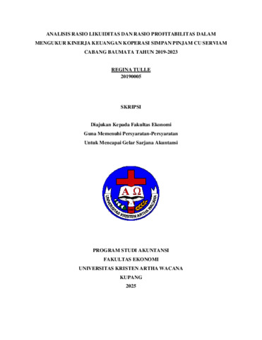 TULLE, Regina (2025) ANALISIS RASIO LIKUIDITAS DAN RASIO PROFITABILITAS DALAM MENGUKUR KINERJA KEUANGAN KOPERASI SIMPAN PINJAM CU SERVIAM CABANG BAUMATA TAHUN 2019-2023. Undergraduate thesis, Artha Wacana Christian University.