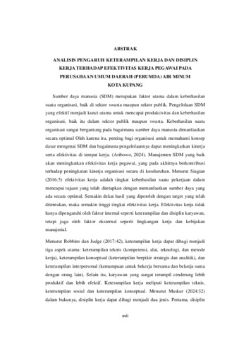 KALELEO, Ayu Maharani (2025) ANALISIS PENGARUH KETERAMPILAN KERJA DAN DISIPLIN KERJA TERHADAP EFEKTIVITAS KERJA PEGAWAI PADA PERUSAHAAN UMUM DAERAH (PERUMDA) AIR MINUM KOTA KUPANG. Undergraduate thesis, Artha Wacana Christian University.
