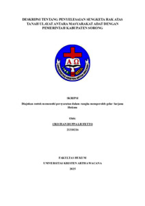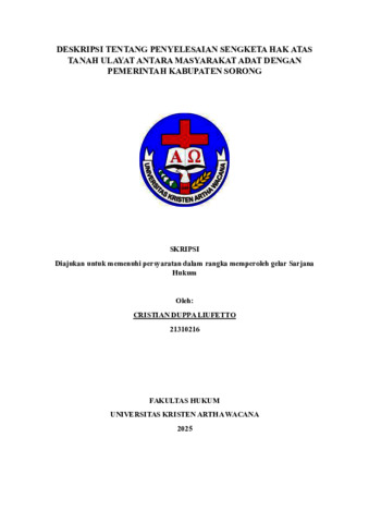 LIUFETO, Cristian Duppa (2025) DESKRIPSI TENTANG PENYELESAIAN SENGKETA HAK ATAS TANAH ULAYAT ANTARA MASYARAKAT ADAT DENGAN PEMERINTAH KABUPATEN SORONG. Undergraduate thesis, Artha Wacana Christian University.