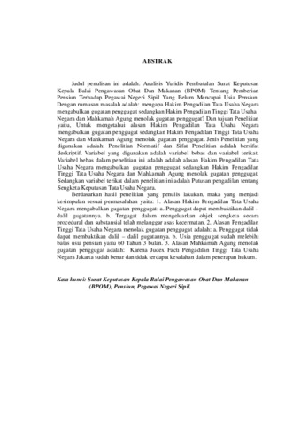 MOEKARI, Melkianus M. (2025) ANALISIS YURIDIS PEMBATALAN SURAT KEPUTUSAN KEPALA BALAI PENGAWASAN OBAT DAN MAKANAN (BPOM) TENTANG PEMBERIAN PENSIUN TERHADAP PEGAWAI NEGERI SIPIL YANG BELUM MENCAPAI USIA PENSIUNAN. Undergraduate thesis, Artha Wacana Christian University.