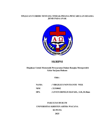 WEE, Virgilias N. (2025) TINJAUAN YURIDIS TENTANG TINDAK PIDANA PENCABULAN SESAMA JENIS PADA ANAK. Undergraduate thesis, Artha Wacana Christian University.