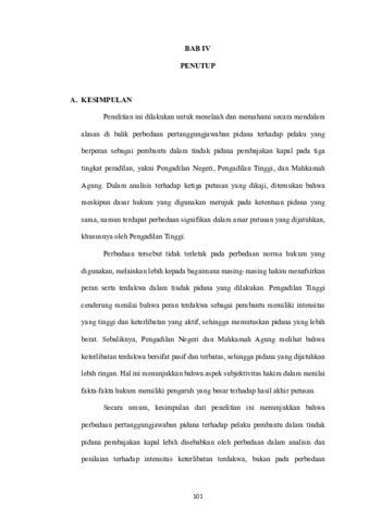 Permasalahan yang diangkat dalam penelitian ini adalah Mengapa pertanggungjawaban terhadap pelaku tindak pidana membantu melakukan pembajakan kapal berbeda pada tingkat Pengadilan Tinggi, dibandingkan dengan Pengadilan Negeri dan Mahkamah Agung. Penelitian ini dilakukan dengan tujuan untuk mengetahui alasan hakim di Pengadilan Tinggi menjatuhkan putusan yang berbeda terhadap pertanggungjawaban pelaku tindak pidana membantu melakukan pembajakan kapal dibandingkan dengan putusan Pengadilan Negeri dan Mahkamah Agung. Jenis Penelitian ini adalah Normatif. Penelitian Normatif adalah sebuah metode penelitian hukum kepustakaan yang merupakan penelitian hukum yang digunakan dengan cara meneliti bahan pustaka atau data sekunder. Penelitian ini bersifat deskriptif, sehingga data yang didapat adalalah data yang menggambarkan secara sistematis dan faktual mengenai objek yang diteliti tentang penerapan suatu hukum terhadap fakta berkaitan dengan permasalahan yang ada. Variabel bebas dalam penelitian ini adalah pertimbangan hukum hakim, sedangkan variabel terikatnya adalah putusan pengadilan terhadap pelaku tindak pidana pembantu pembajakan kapal. Teknik analisis data dalam penelitian ini adalah menggunakan deskriptif kualitatif yaitu melibatkan pengumpulan dan analisis sumber bahan yang telah terkumpul, baik primer maupun sekunder. Data yang diperoleh akan dianalisis secara sitematis untuk menghasilkan kesimpulan yang relevan dengan permasalahan yang dibahas. Berdasarkan hasil penelitian yang penulis lakukan menunjukkan bahwa perbedaan pertimbangan hakim dalam setiap tingkat peradilan terkait dengan pembuktian peran terdakwa sebagai pelaku pembantu dalam tindak pidana pembajakan kapal. Perbedaan ini menunjukkan bagaimana pertanggungjawaban pidana terhadap pelaku pembantu dapat dipandang secara berbeda tergantung pada penilaian terhadap alat bukti dan keterlibatan terdakwa.